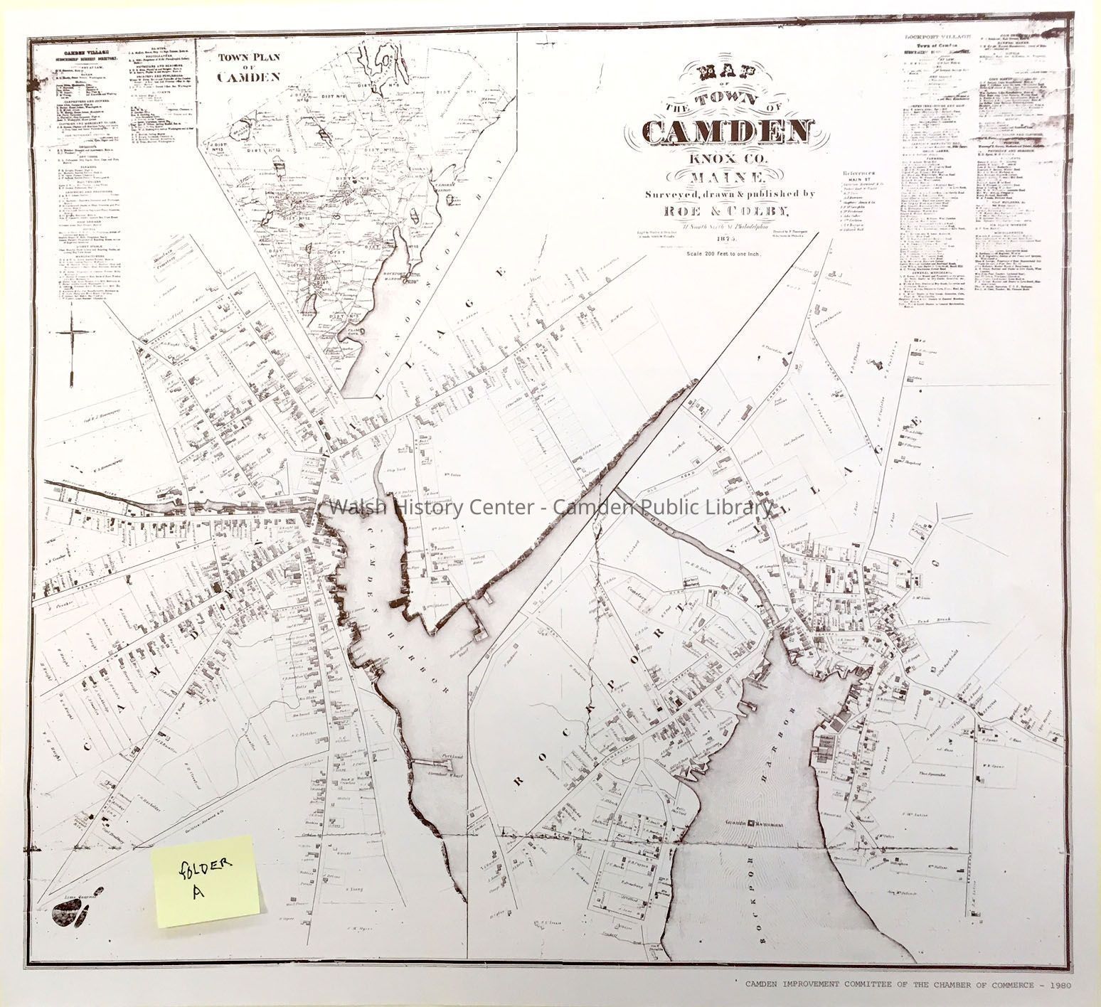 MAP OF THE TOWN OF CAMDEN, KNOX CO. MAINE. Surveyed, drawn, and published by ROE & COLBY, 31 South Sixth Street Philadelphia. Scale: 200 feet to one inch [on the original map]. This reduced copy of the 1875 original was reprinted by the Improvement Committee of the Chamber of Commerce in 1980.
