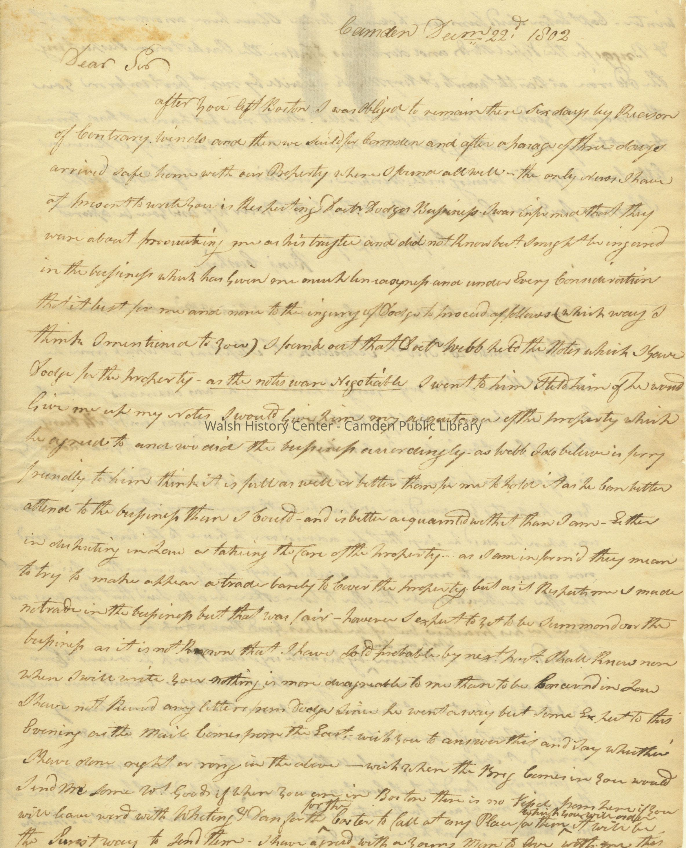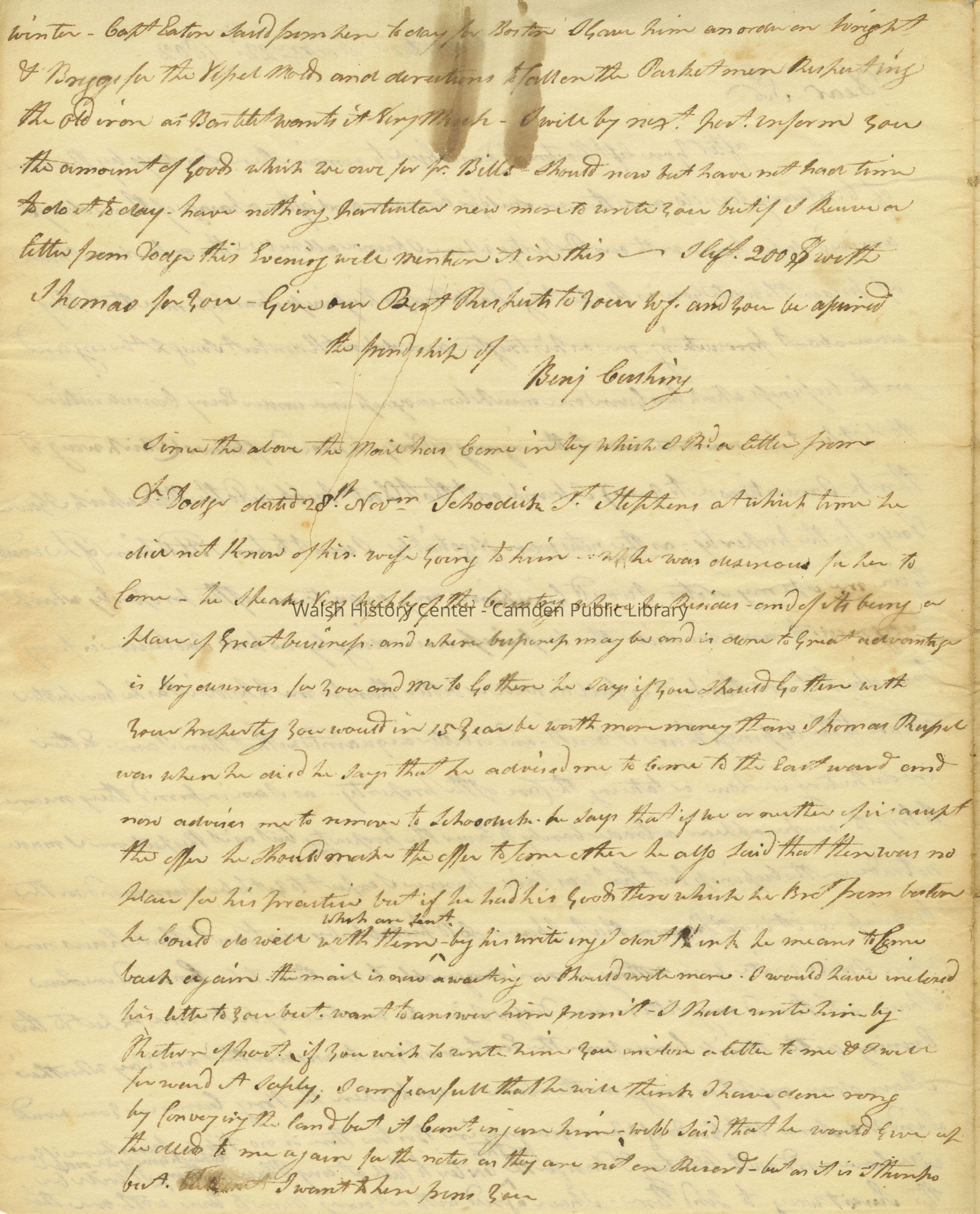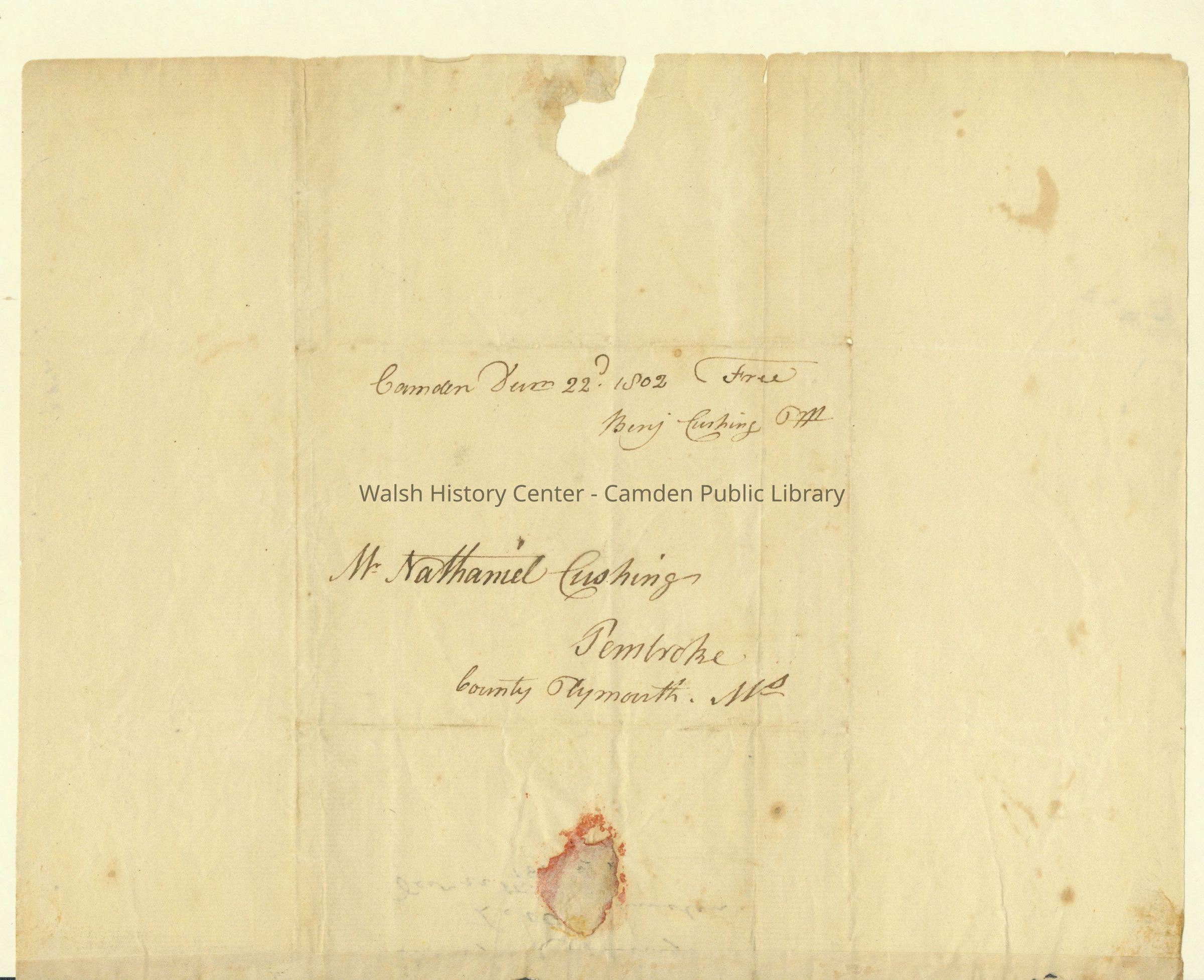 Letter (2 pgs.) from Benjamin Cushing to Nathaniel Cushing dated December 22, 1802.