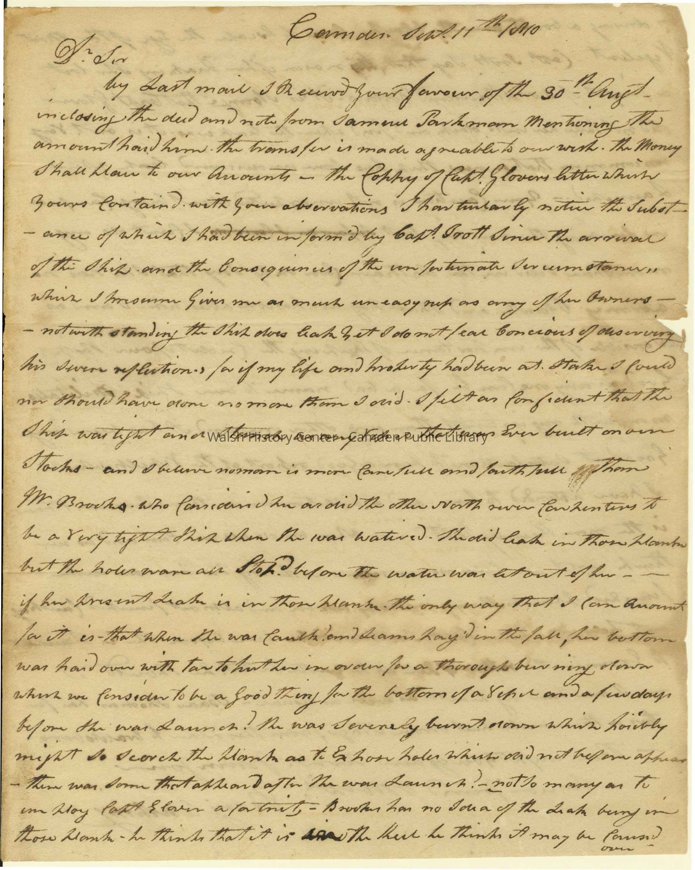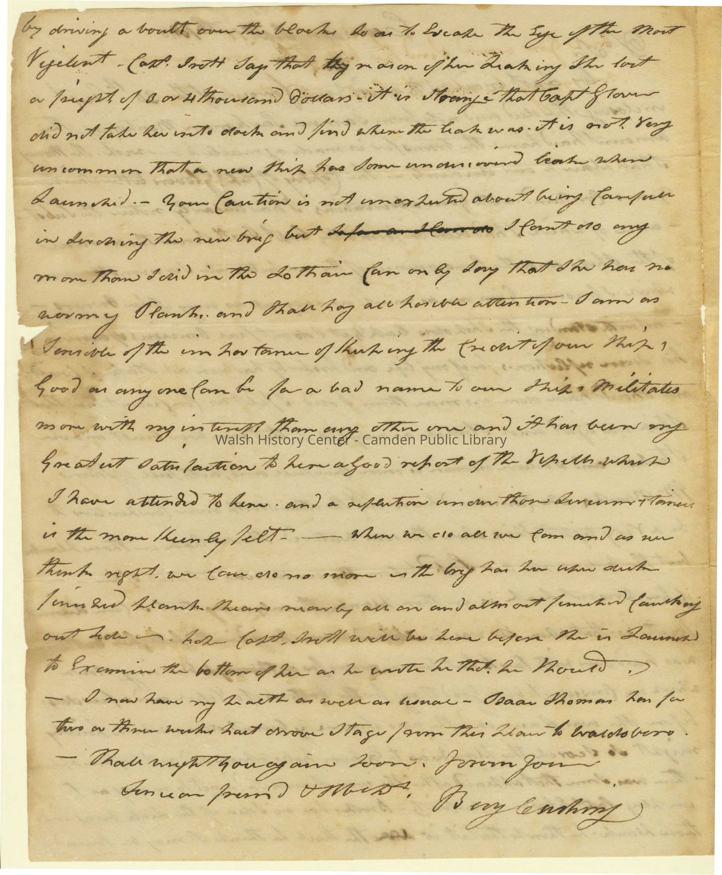 The letters are primarily about his trade as a storeowner and shipbuilder. He mentions the ships Daphne and Lothair, Captains Eaton and Glover, and receipt of timber.Collection