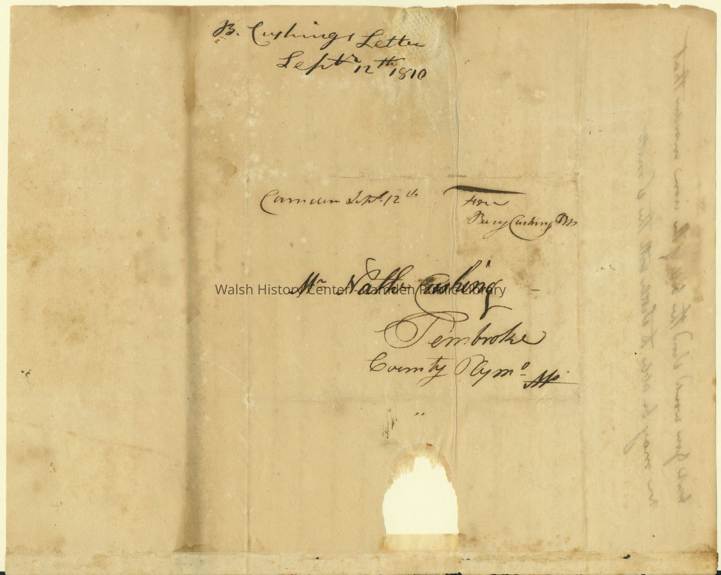 Letter (3 pgs) from Benjamin Cushing to Nathaniel Cushing dated September 12, 1810.