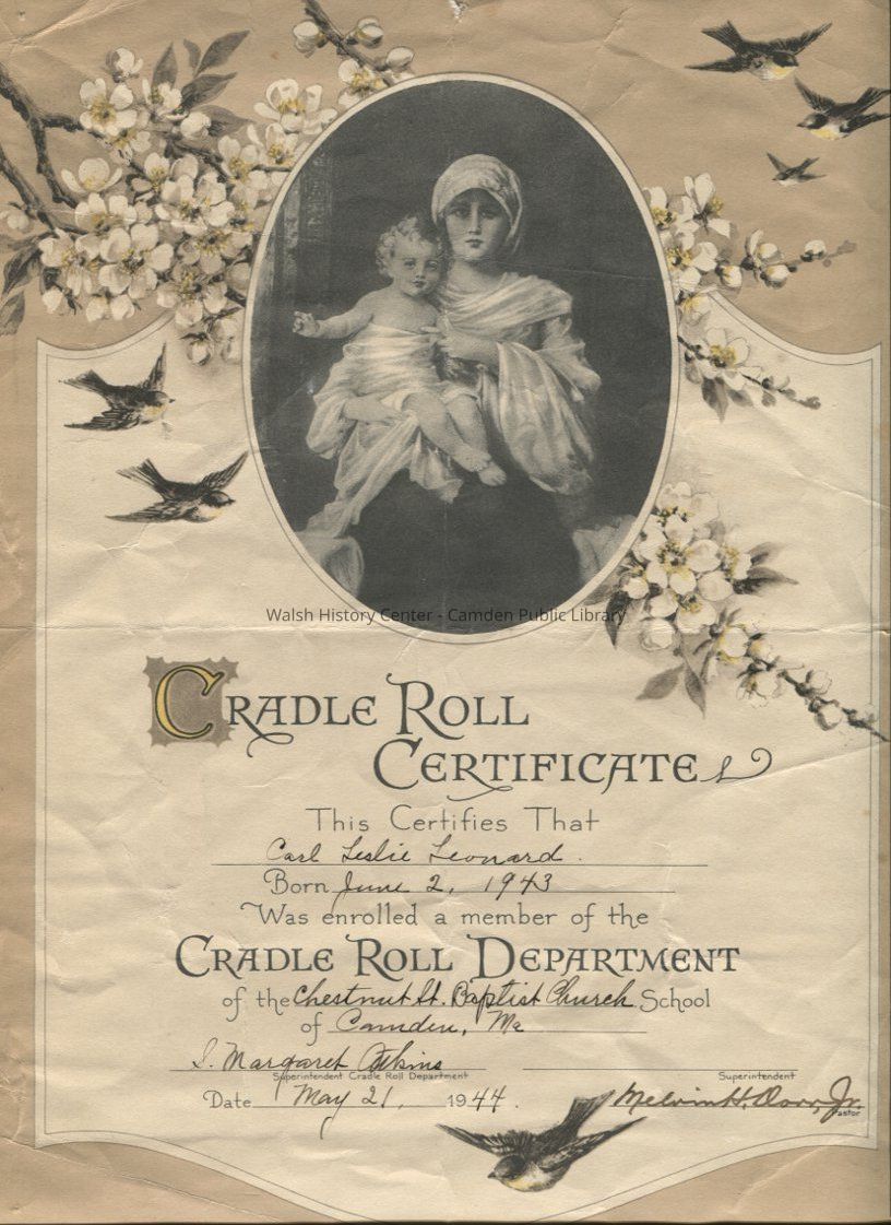 Cradle roll certificate for Carl Leslie Leonard, born June 2, 1943 and enrolled as a member of the Chestnut Street Baptist Church School of Camden, Maine in May 1944.Collection