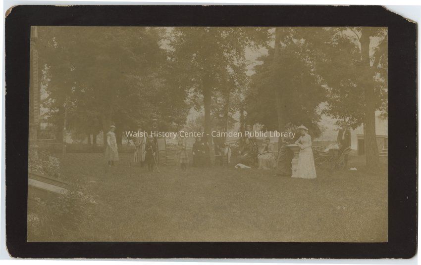 Photograph of people seated and children playing croquet on the lawn. There appears to be water in the background, but location is unknown.Photograph Details