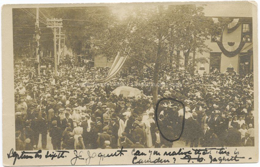 Postcard of a huge crowd gathered at the Conway boulder on the grounds of the Elm Street School on the corner of Union and Elm Streets. The boulder was dedicated to the memory of William Conway in 1906. Note the young boys climbing the pole to the left of the image.Collection