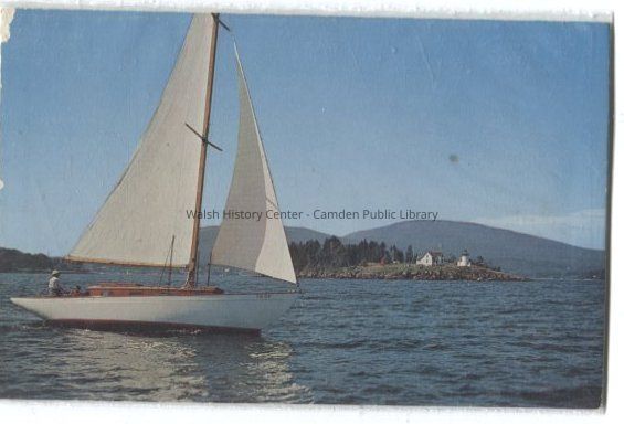 Color photographic postcard of a white sloop sailing past Curtis Island with Mt. Battie and Mt. Megunticook in the background.Collection
