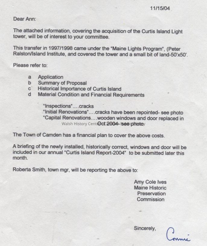 Scanned prints of five color photographs and report from Eliott "Connie" Conover regarding acquisition and renovation of the Curtis Island lighthouse and keeper's cottage. Includes diagram, 8 color images, copy of application, and 5-page report by Conover.Collection