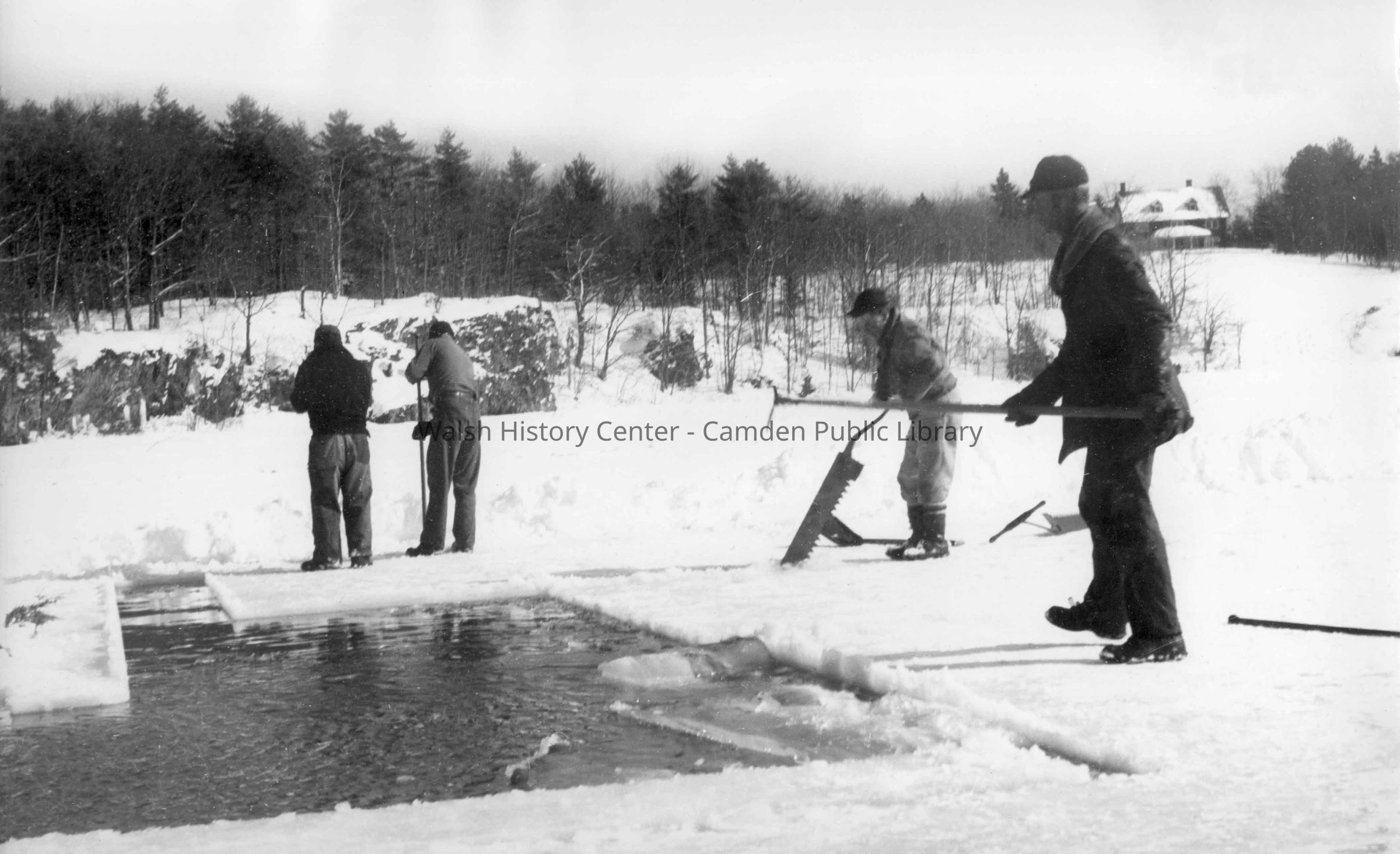 Photograph (b/w) from the collection of Frank E. Claes featuring four individuals cutting ice at Lily Pond in Rockport, Maine.