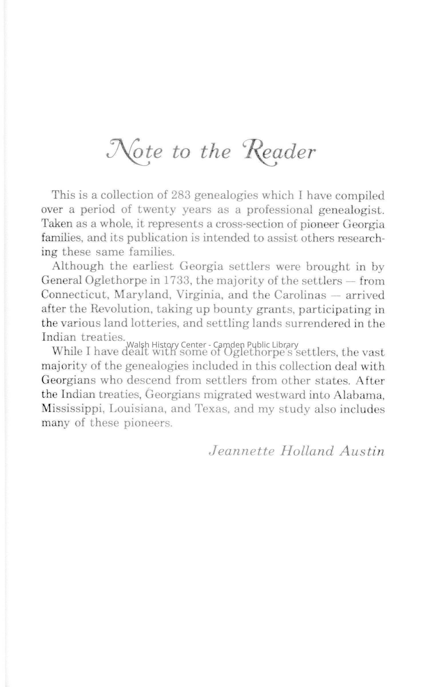 A collection of 283 genealogies which represents a cross-section of pioneer Georgia families. Majority of the genealogies included deals with Georgians who descended from settlers from other states.Collection