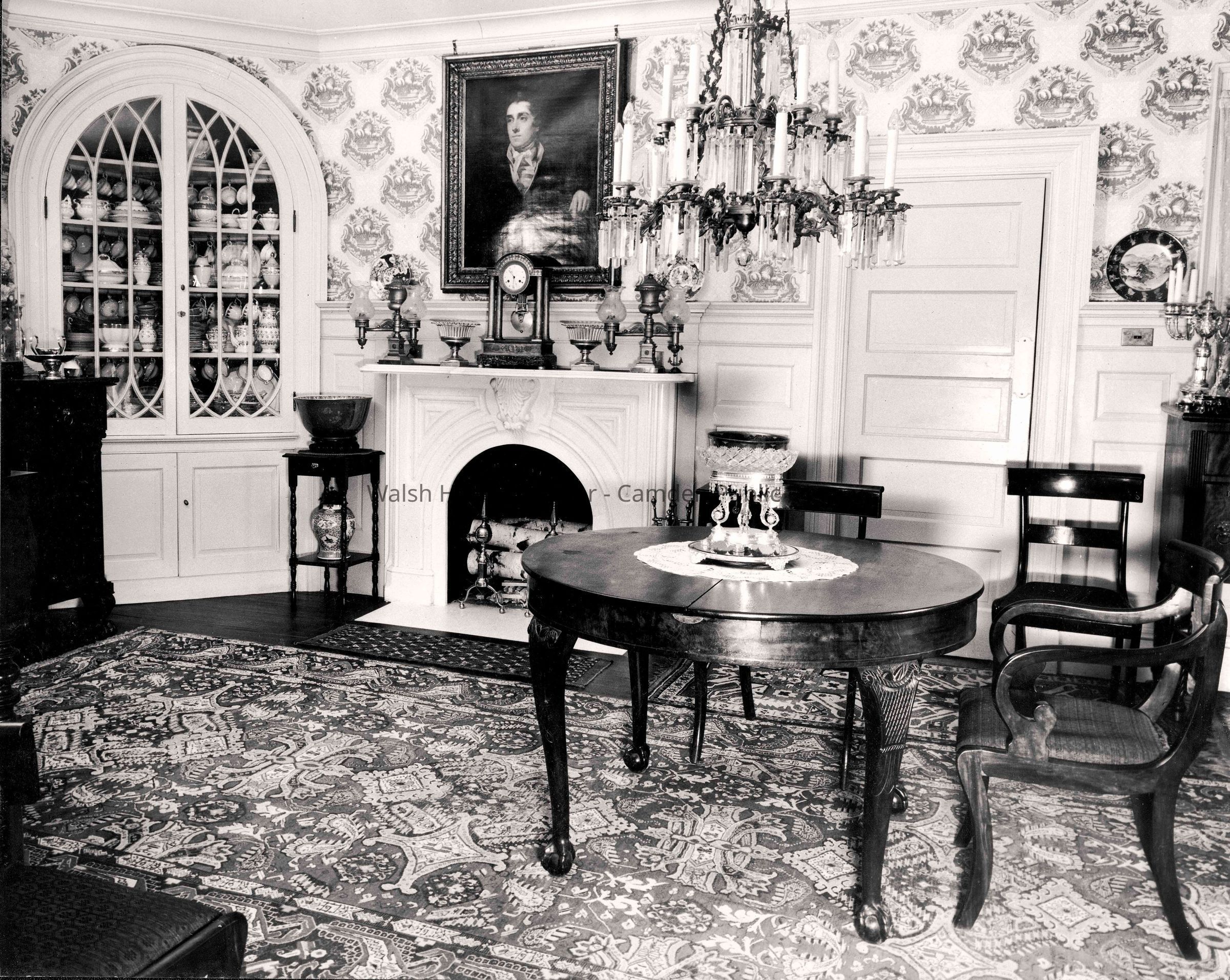 Scanned copy of photogragh from "Hill Acres" estate album. Original album owned by Lyn Woods, Camden, ME. Interior of dining room.