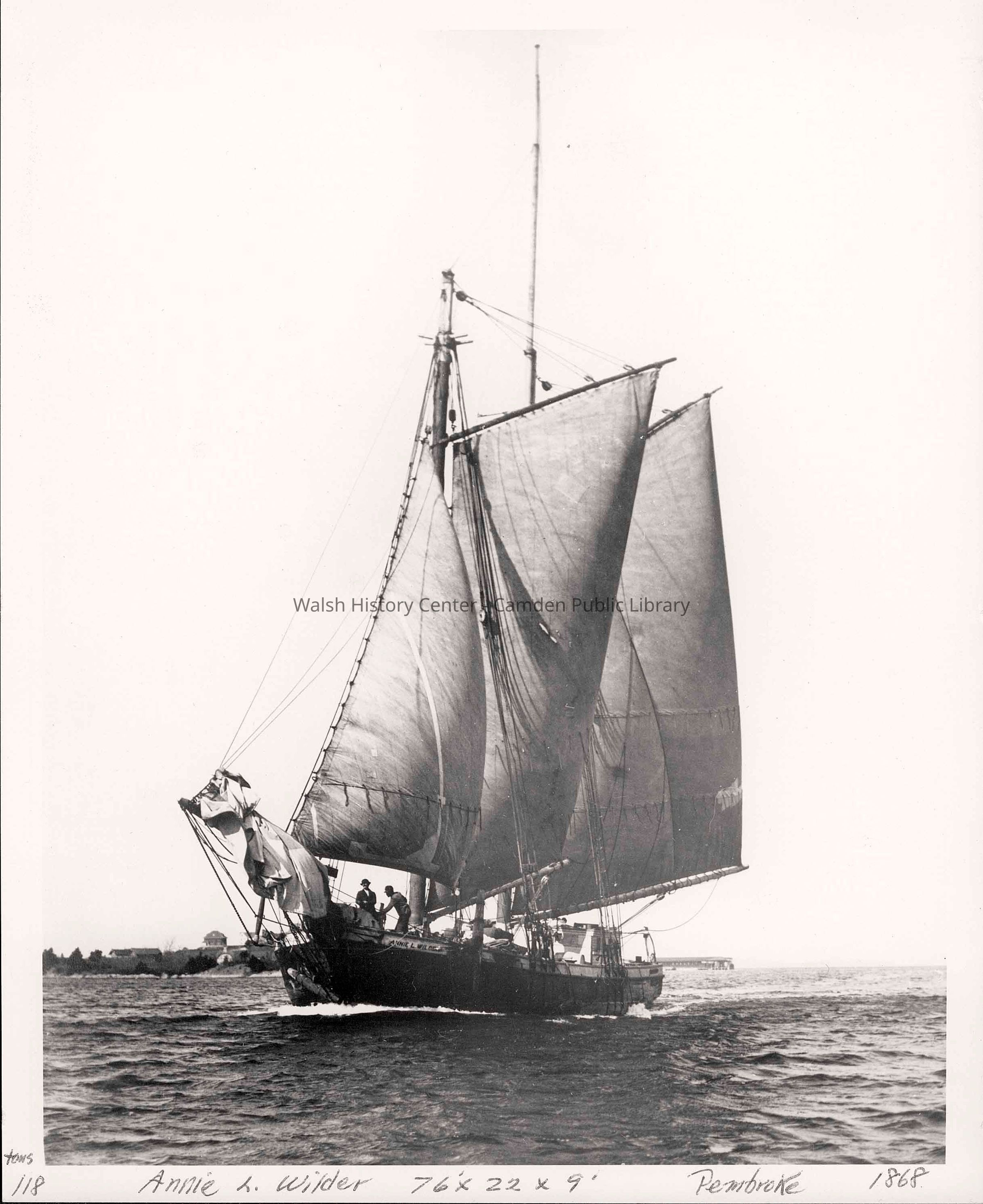 Two-masted schooner "Annie L. Wilder" built in Camden in 1868. The vessel was 118.74 tons, Length - 76 ft., Beam - 22.5 ft., Depth - 9 ft. The vessel was wrecked on Negro Island in Camden harbor in 1905.Collection