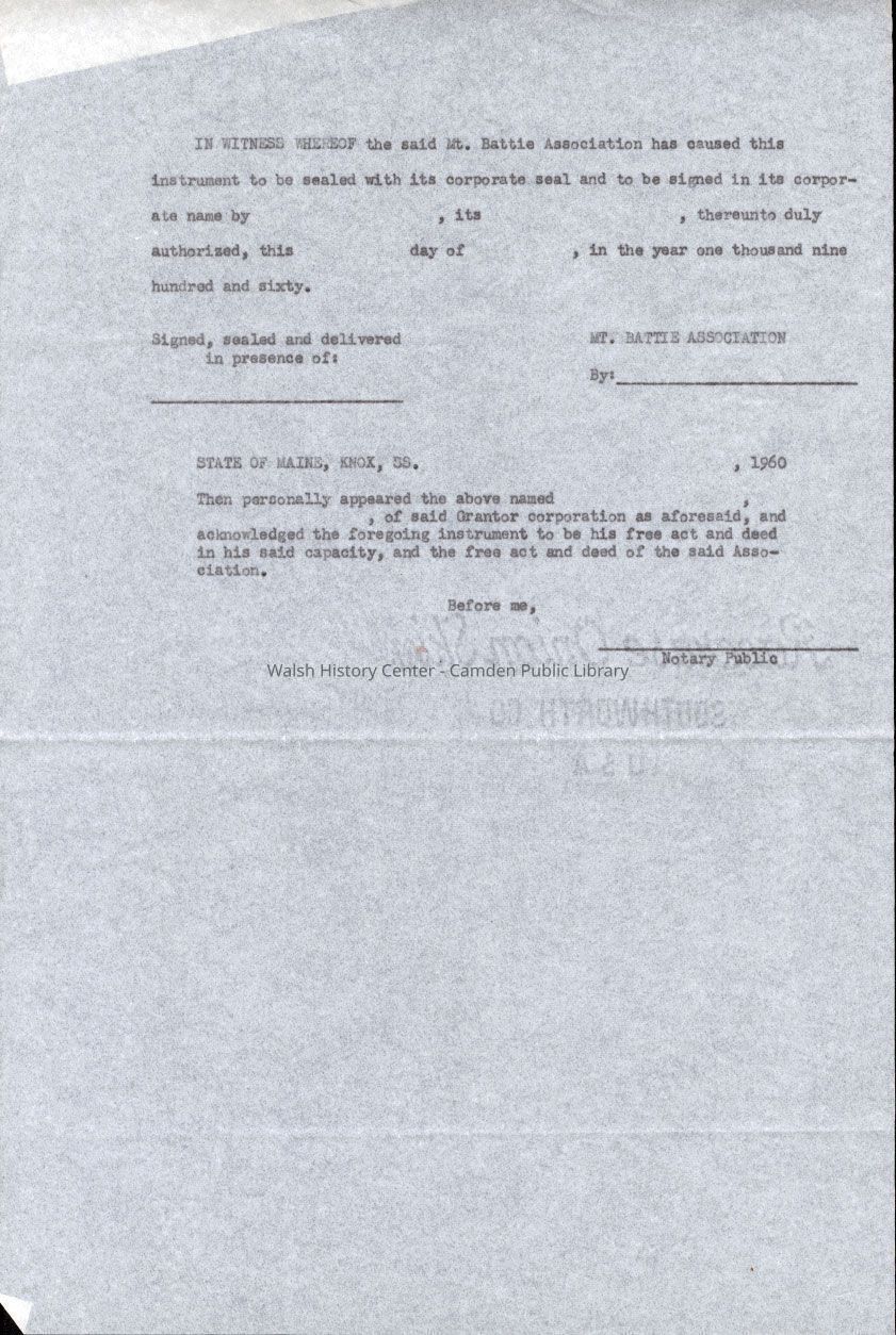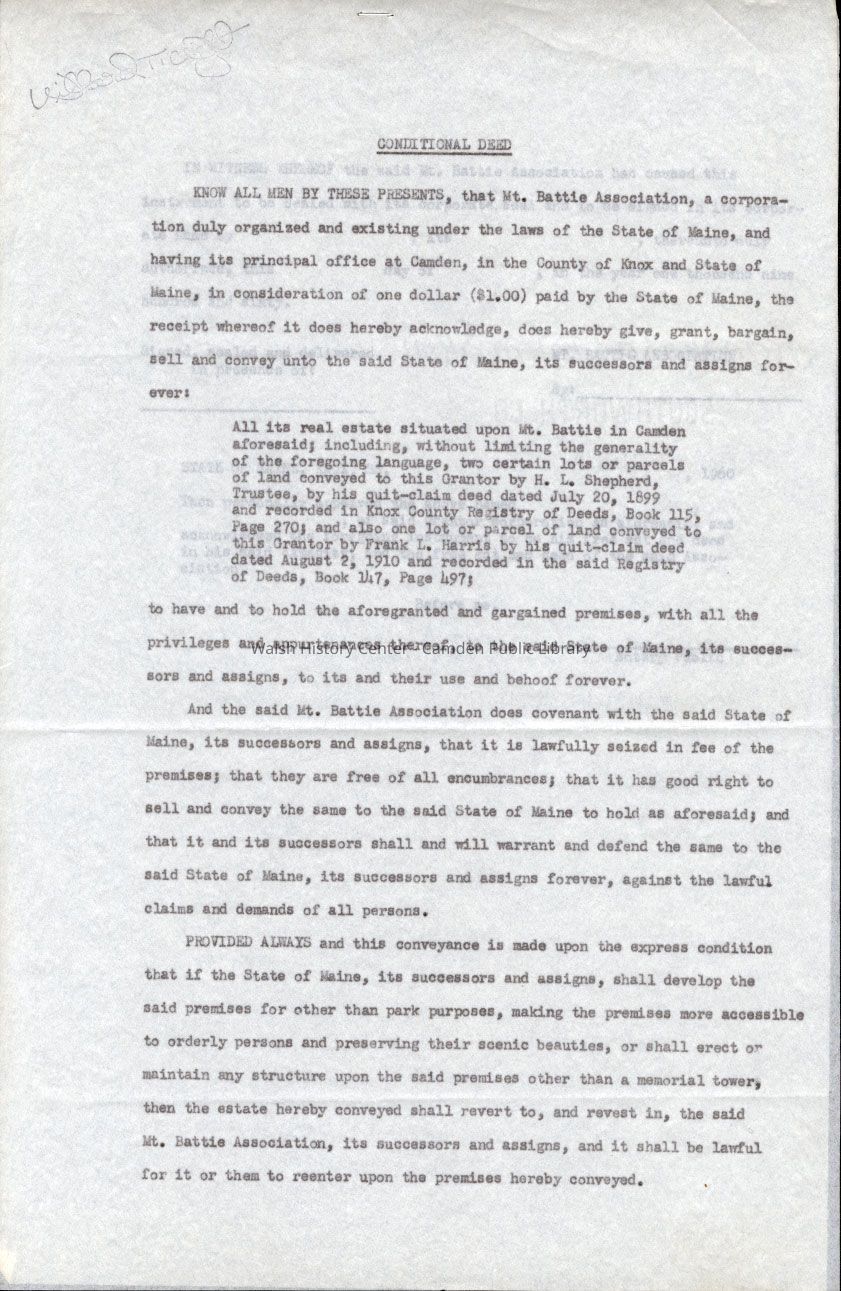 Conditional Deed from the Mt. Battie Association to the State of Maine conveying the Mt. Battie property for one dollar ($1.00). Unsigned.Collection