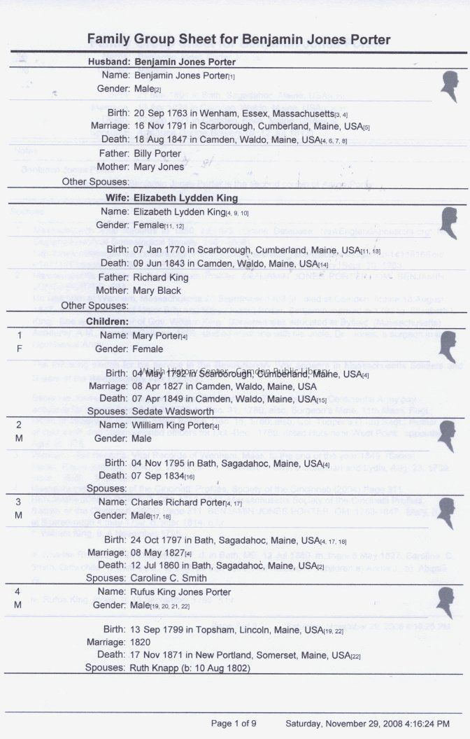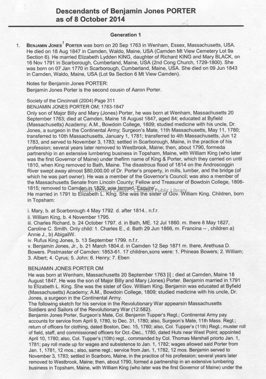 Genealogy research relating to the genealogy of the Benjamin Jones Porter, born 20 September 1763 in Wenham, Massachusetts, died 18 August 1847 in Camden, Maine. Research covers three generations.Collection