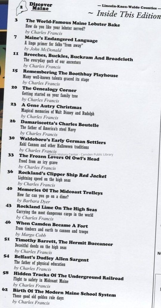 Articles in this edition on the following subjects: Maine Lobster Bake, our endangered language, getting started with your family tree, the Boothbay Playhouse, Charles Boutelle of Damariscotta (the father of America's steel Navy), memories of Walt Disney and Rudolph, the tale of the frozen lovers of Owl's Head, Rockland's Clipper Ship "Red Jacket," the trolleys of the mid-coast, Rockland's Lime industry, the fortification of Camden in 1814, the strange tale of Timothy Barrett of Liberty, Belfast's own Dudley Allen Sargent, the father of physical education, a glimpse at Maine's participation in the underground railroad, and the birth of the modern Maine school system.