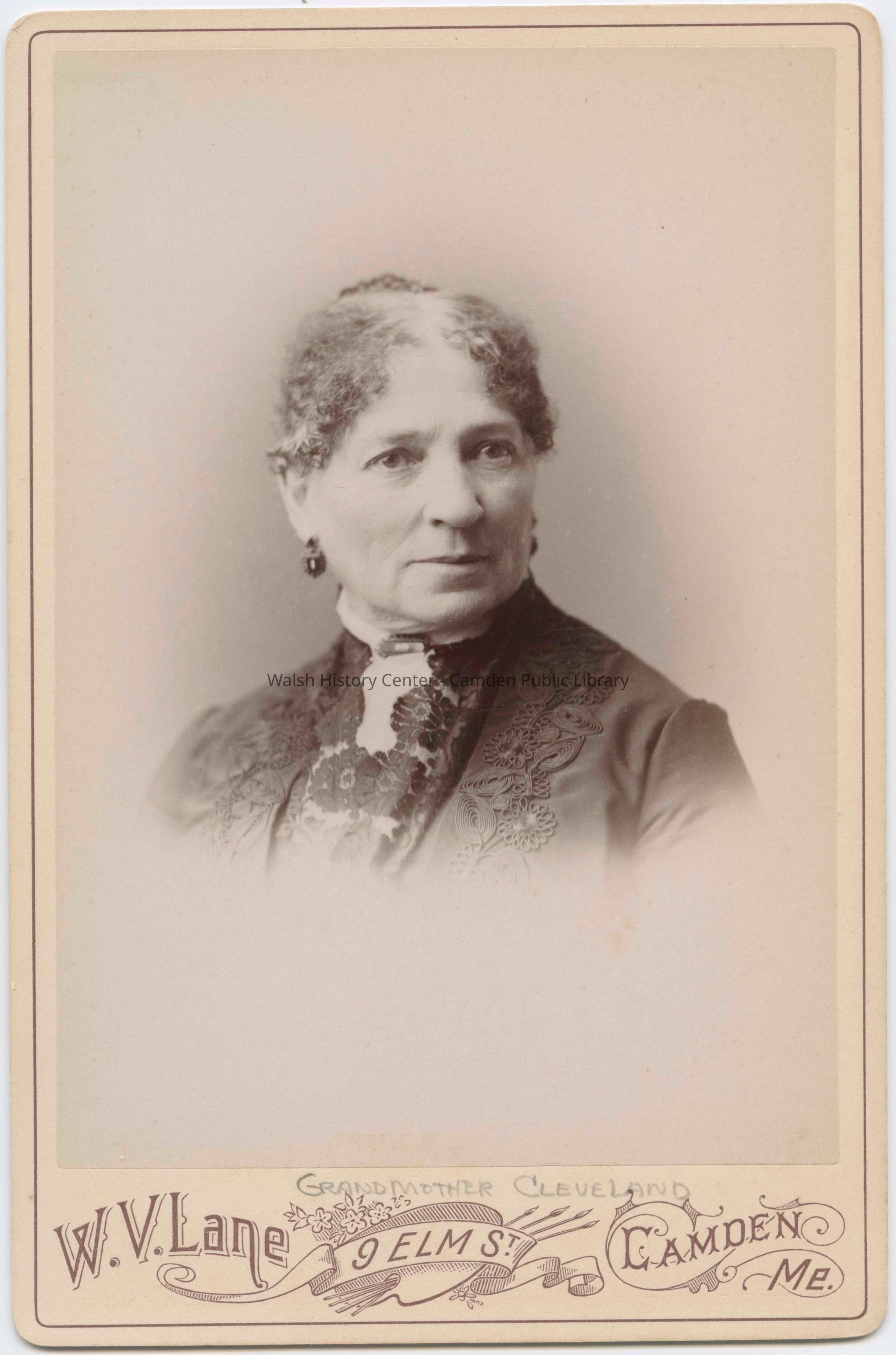 Sepia cabinet card photograph of Dorcas Bagley Simonton Cleveland, who married Harvey H. Cleveland of Camden in October 1838. Her granddaughter was Theresa Parker, who married Charles Wilkes Babb, superintendent of the Knox Woolen Mill. Theresa's extensive collection of photos of the family is in the Walsh History Center archives.Collection
