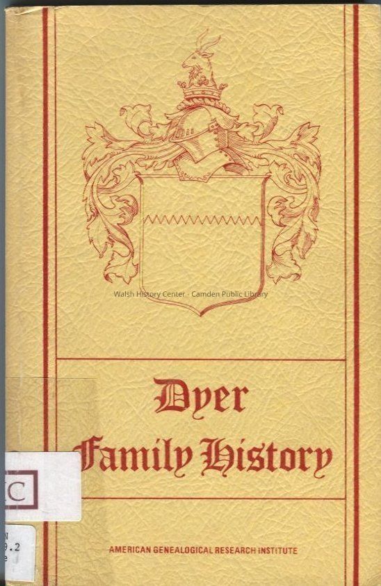 Dyer family history including short biographies and references. Table of contents lists the following chapters: Family Name and Arms, Ancestral Emigrants, Early Marriage Records, Census of 1790, Patriots and Veterans, Place Names, and Constructing Your Family Tree. Contains appendix for reference and genealogical research.