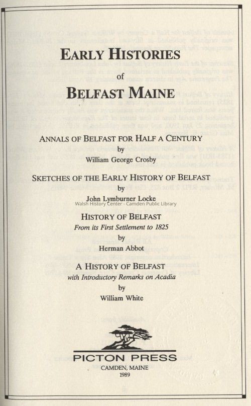 Annals of Belfast for Half a Century (Crosby); Sketches of the Early History of Belfast (Locke); History of Belfast (Abbot); A History of Belfast (White)Description
