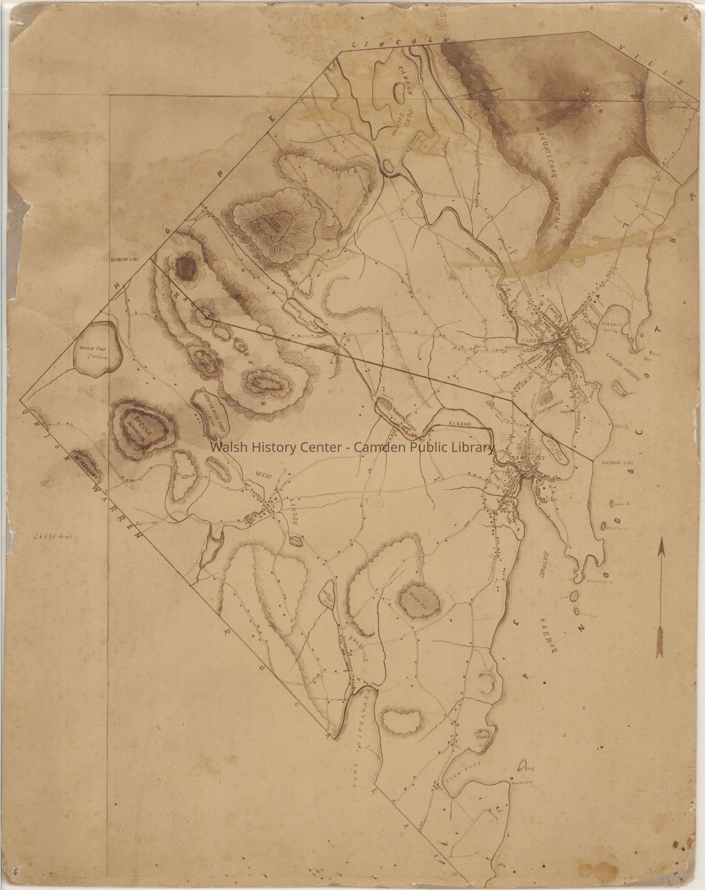 as Canaan Pond; Mirror Lake is labeled "Oyster River Pond." This map is undated, but appears to have been made about 1891 as the original town of Camden was splitting into the towns of Camden and Rockport (which occurred on 25 February, 1891). As it does not show the transfer of the quarries from Camden to Rockport, which occurred on 24 March, 1891, the map must have been drafted at some time before that date. It was acquired as a Compact Disk with a reduced size print of the map as a cover for the case, and also printed as a colour print. The source of the