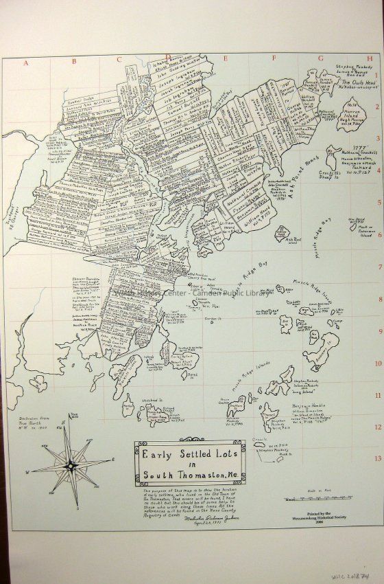 EARLY SETTLED LOTS IN SOUTH THOMASTON, ME. By Malcolm Putnam Jackson, April 28, 1971. Printed by the Wessaweskeag Historical Society, 2004. This map shows early settlers on lots in South Thomaston, with references to deeds in the Registrar of Deeds' Office. An attached note from Charles Hartman (10 Nov. 2008) says, "This information is for Library use and should not be reprinted for resale." When ordered through the Wessaweskeag Historical Society, the map is accompanied by 3 pages, that show (1) explanatory material; (2) Inhabitants of Thomaston (S. Thomaston portion) at incorporation in 1777 and (3) names and lot locations on map. The map is gridded in number/letter coordinates to facilitate locating the names and lot locations.Collection