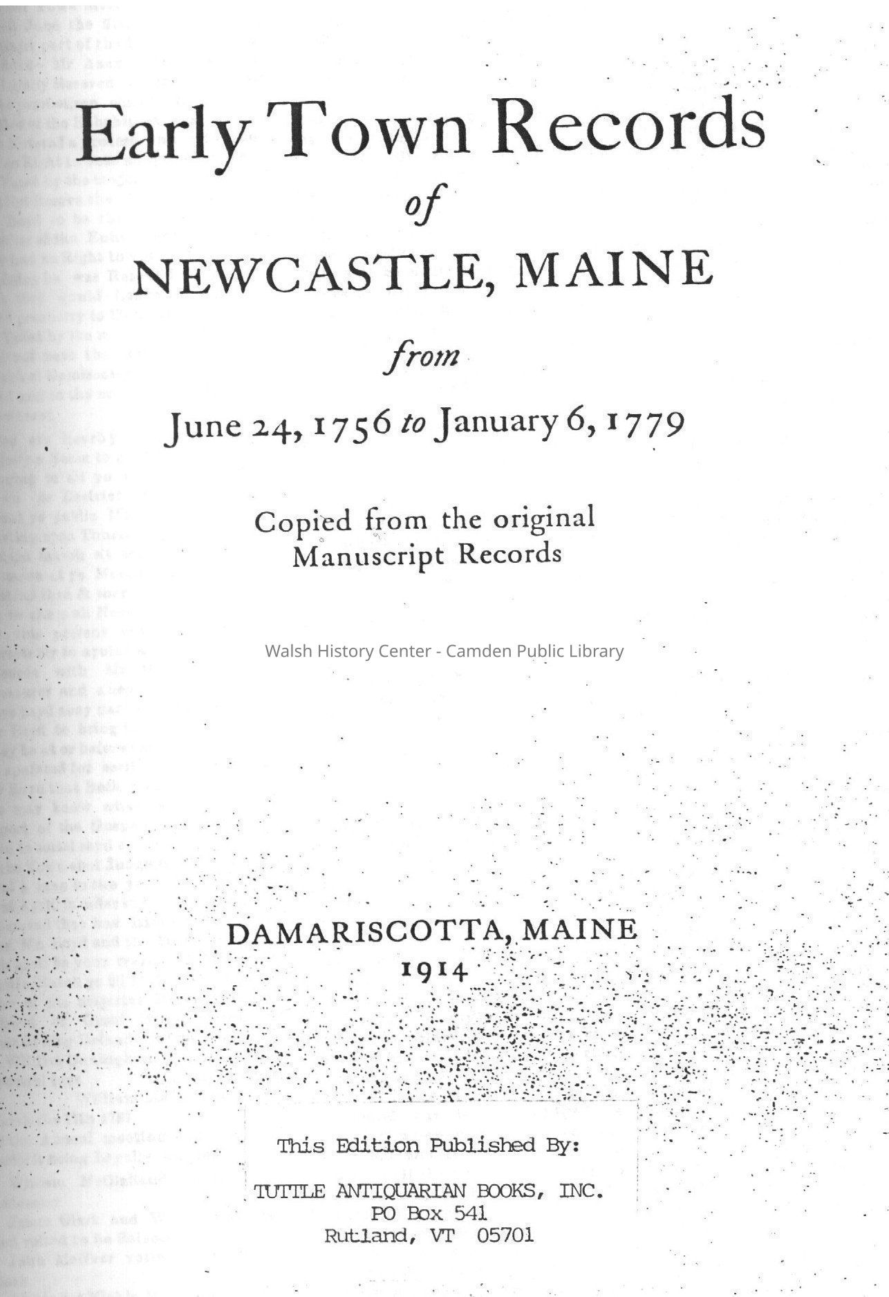 As titled, includes copies from original manuscript records of early town records of Newcastle, Maine from June 24, 1756 - January 6, 1779.