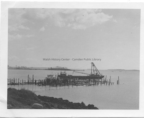 Black and white photograph of the burning of the derelict Eastern Steamship Company wharf in Camden in May 1959. This picture shows the aftermath of the fire with only the pilings remaining.Collection