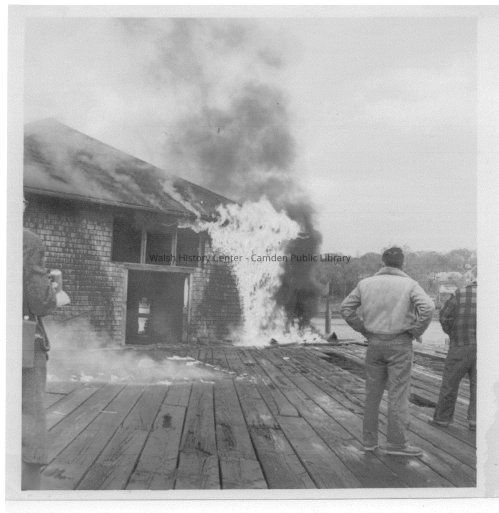 Black and white scan of photograph of the burning of the derelict Eastern Steamship Company wharf in Camden in May 1959.Collection