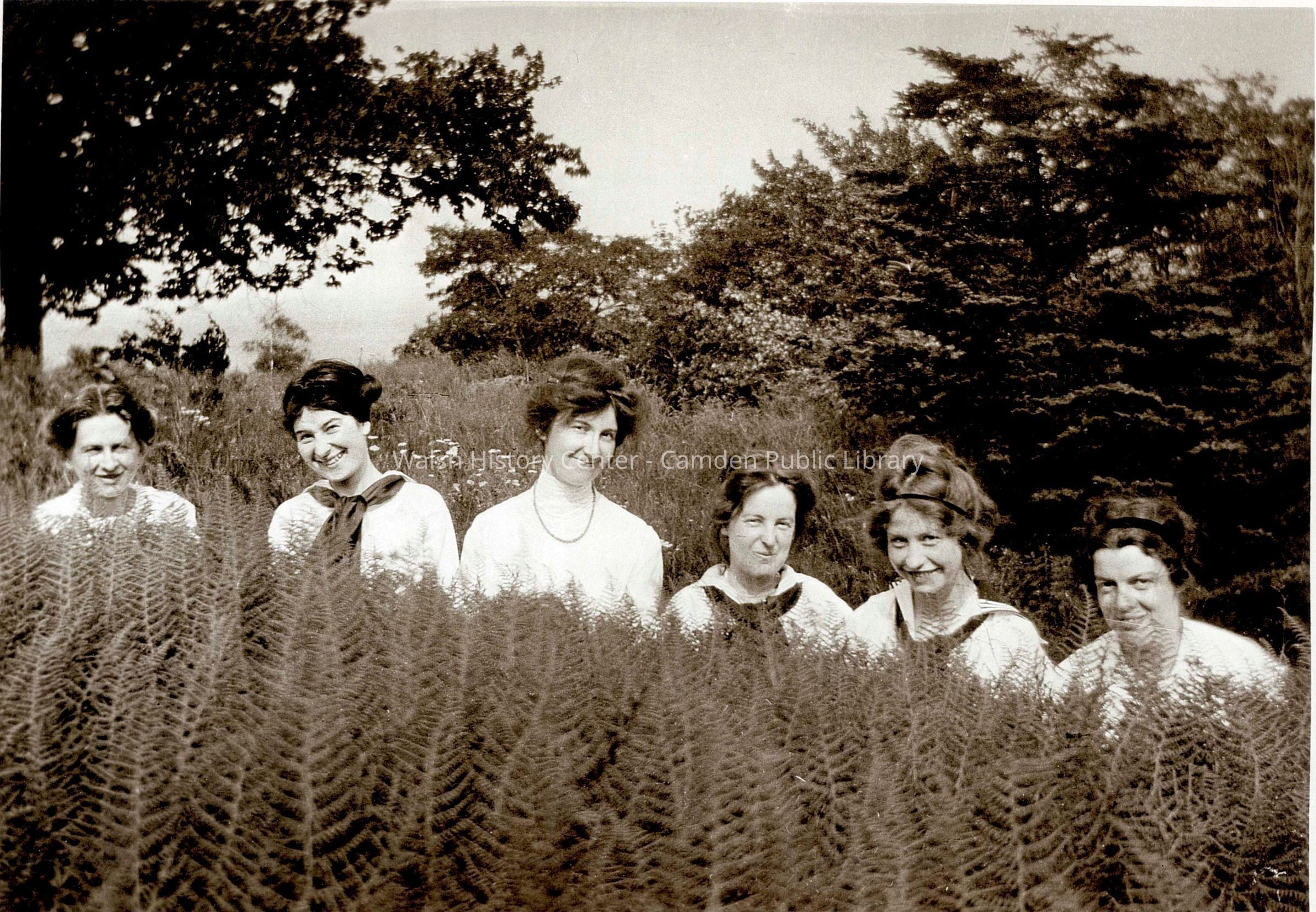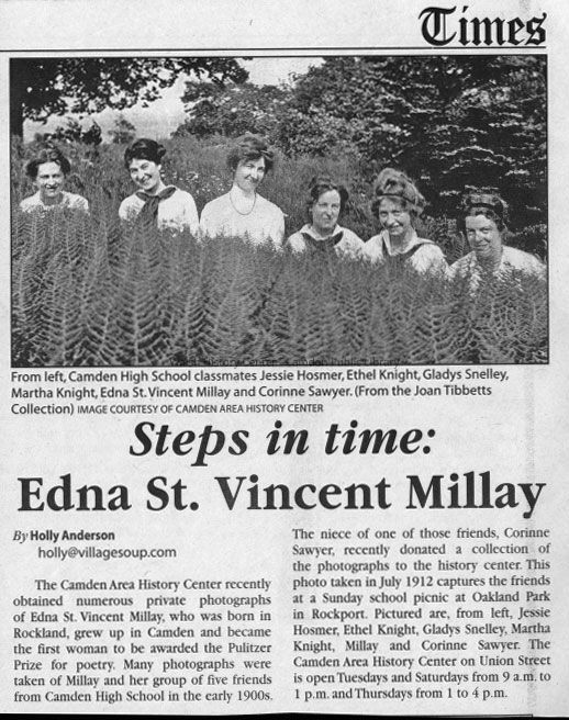 Edna St. Vincent Millay and several friends at a Sunday school picnic at Oakland Park in Rockport. Image was taken July 1912, just a month before Millay's "discovery" at Whitehall Inn in Camden. She would attend Vassar and become the first female Pulitzer Price-winning poet. Left to right are: Jessie Hosmer, Ethel Knight, Gladys Snelley, Martha Knight, Edna St. Vincent Millay, and Corinne Sawyer.Collection