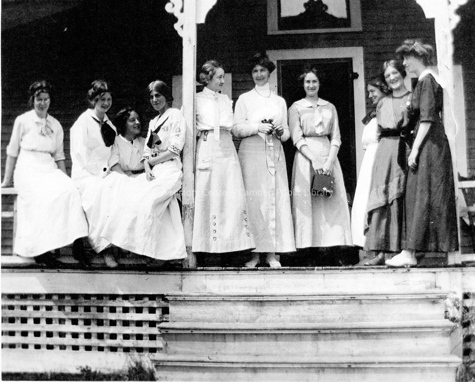 Photograph of Edna St. Vincent Millay and her Camden High School classmates on a seaside porch, likely at Ash Point in Rockland. The photo is not dated.