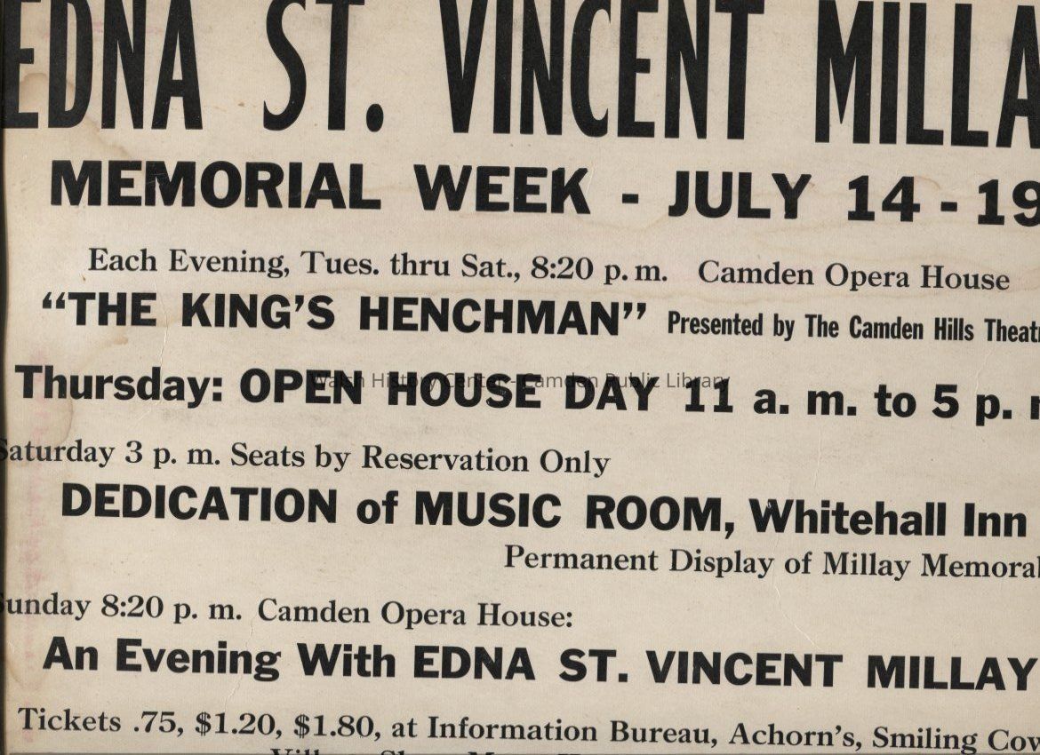 Advertisement for series of events related to the Edna St. Vincent Millay Memorial Week held in CamdenCollection