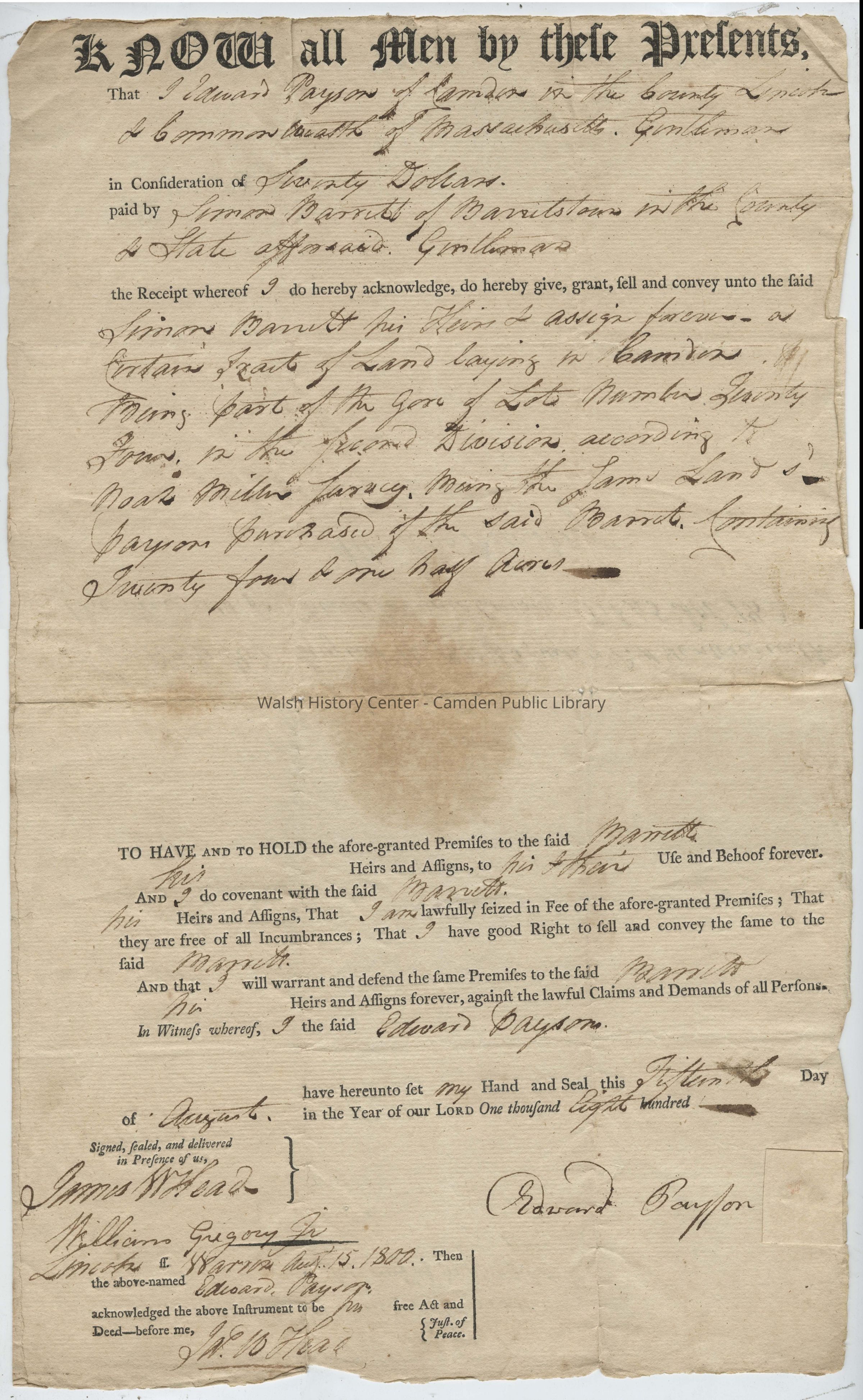 That I Edward Payson of Camden in the County Lincoln & Commonwealth of Massachusetts. Gentleman in Consideration of Seventy Dollars paid by Simon Barrett of Barretstown in the County & State aforesaid. Gentleman the Receipt whereof I do hereby acknowledge, do hereby give, grant, sell and convey unto the said Simon Barrett his Heirs & assign forever - a Certain Tract of Land laying in Camden Being part of the gore of Lot Number Twenty Four in the Second Division according to Noah Millers Survey, Being the same Land sd. Payson purchased of the said Barrett Containing Twenty four & one half acres