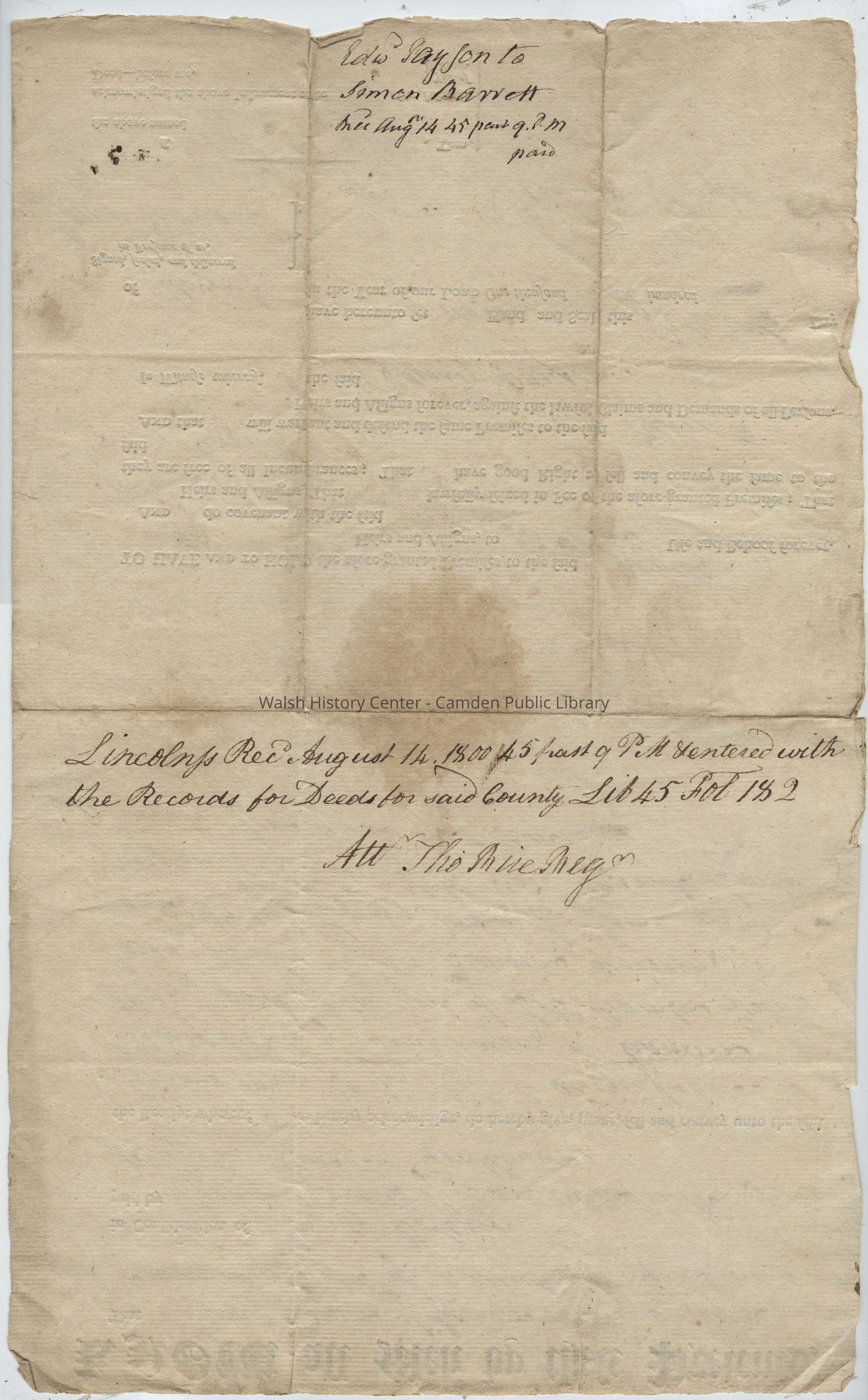 Lincoln ss Recd August 14, 1800 45 past 9 PM & entered with the Records for Deeds for said County Lib 45 Fol 182