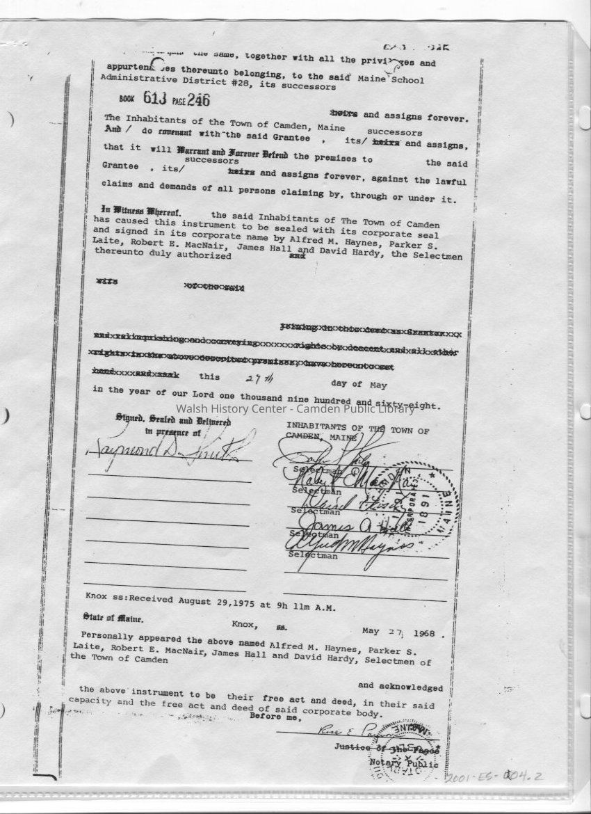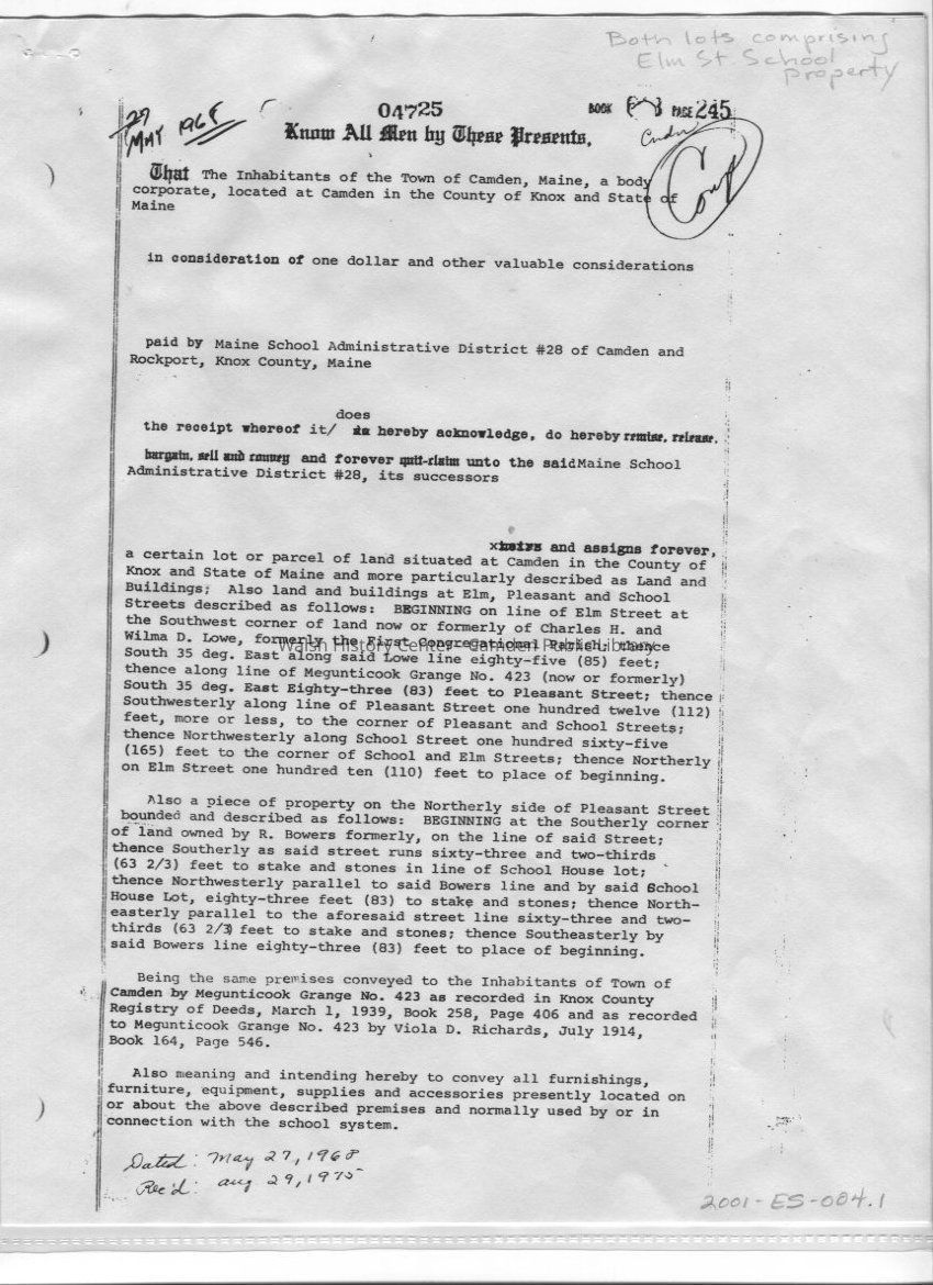 Photocopy of the quit-claim deed transferring the Elm Street School property from the Town of Camden to MSAD #28. This document is recorded in the Knox Registry of Deeds, Book 613, Page 245 and dated May 27, 1968 and recorded August 29, 1975.Collection