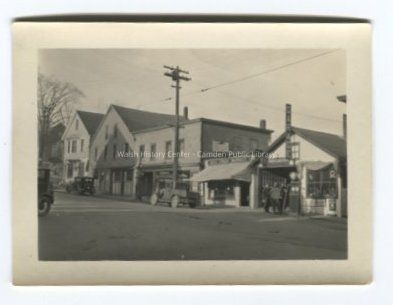 Small black and white photograph of Stratton's seafood market and Elwell's garage on Main Street in Camden. The Camden Public Library is just visible in the left background.Collection