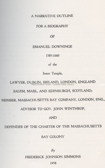 A narrative outline for a biography of Emanuel Downing 1585-1660 of the Inner Temple, Lawyer, Dublin, Ireland, London, England, Salem, Mass., and Edinburgh, Scotland; Member, Massachusetts Bay Co., London, Engl., Advisor to Gov. John Winthrop, and Defender of the Charter of The Massachusetts Bay Colony.
