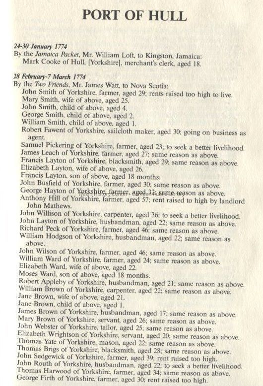 By 1773 Great Britain was concerned by the exodus of working class people to the American Colonies. The government instituted a system of reporting the names, ages, occupations and residences of every person taking ship for an overseas port and to include their reasons for leaving the country. The author has re-examined these registers and compiled the information arranged in alphabetical order of ports of departure.