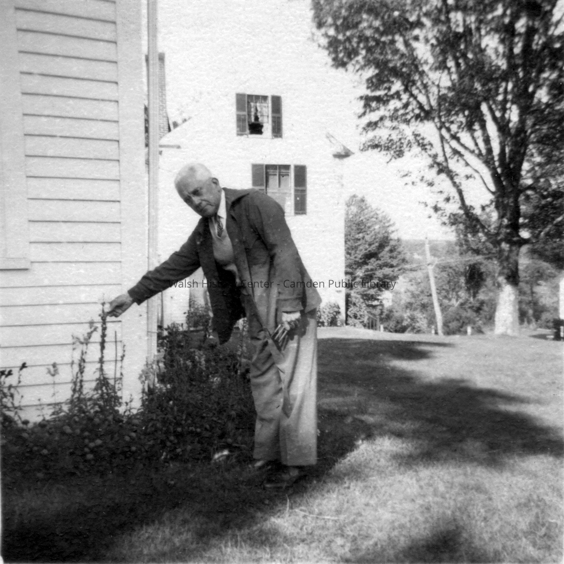 Photo (b/w) of Edward Walsh outside home in Lincolnville with hollyhocks.Collection