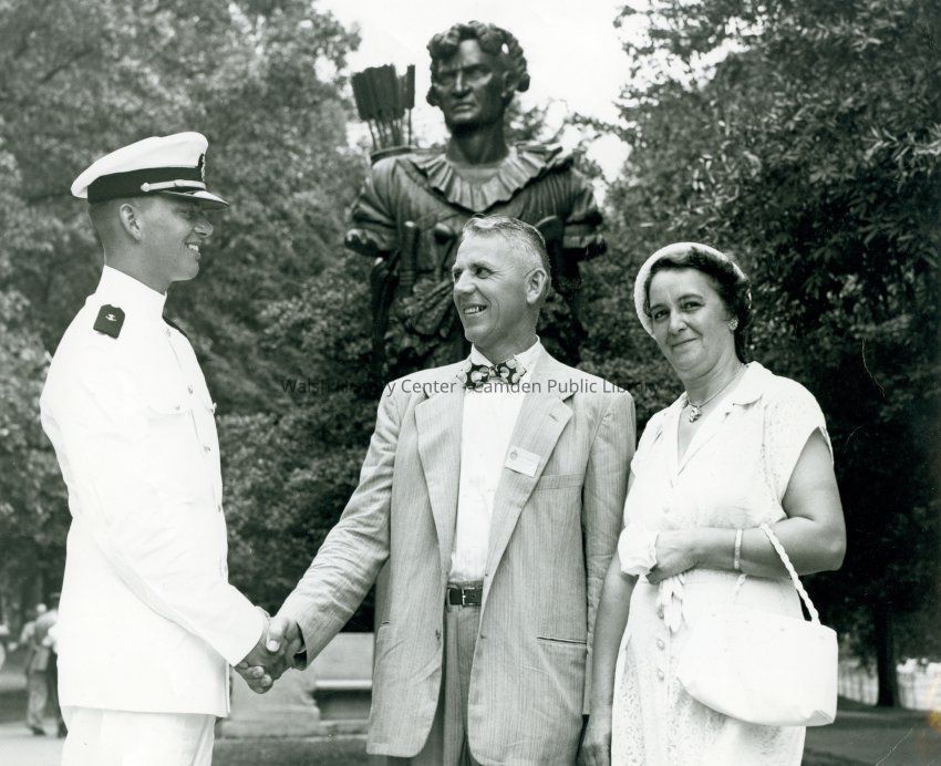 Released official Naval photograph (b/w) of Mr. and Mrs. Ero Masalin shown with their son, Midshipman Fourth Class Charles E. Masalin, in front of the Naval Academy's famed statue of Tecumseh. The Masalins were among more than 600 families from all parts of the country who visited the U. S. Naval Academy, Annapolis, MD., for a special three-day "open house" for parents of the new Class of 1955.Collection