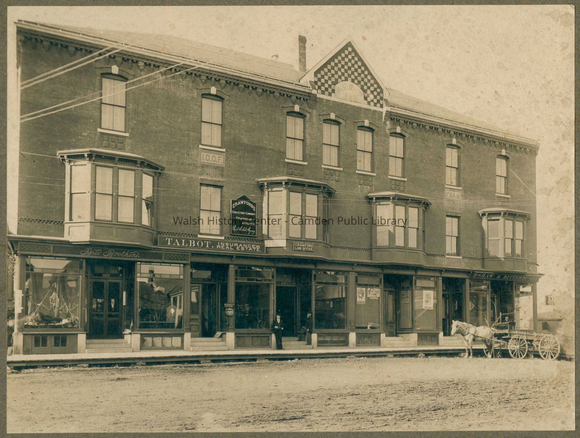 Johnsons Knight Block on Elm Street in Camden, Maine, including the storefronts of Shaw & Ritterbush, Talbot Insurance & Real Estate, Crawford Law Office, and Rose Brothers; in the masonry wall there are blocks that read IOOF, F&AM, and at the apex, KNIGHT 1888.