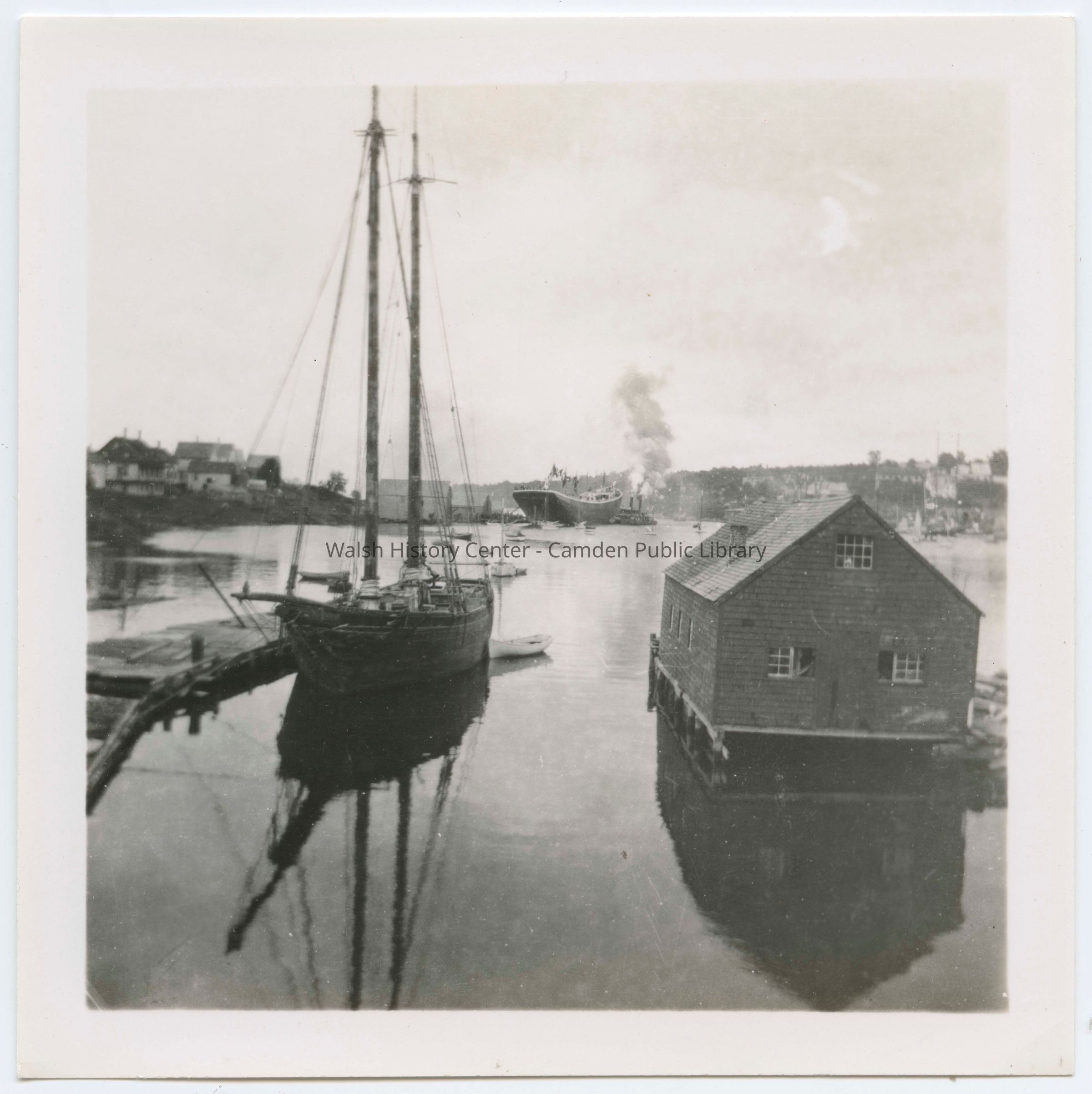 Black and white photograph from the head of Camden harbor on August 14, 1900. Photo shows small schooner in foreground, small building and the George W. Wells in the background after launching.Collection