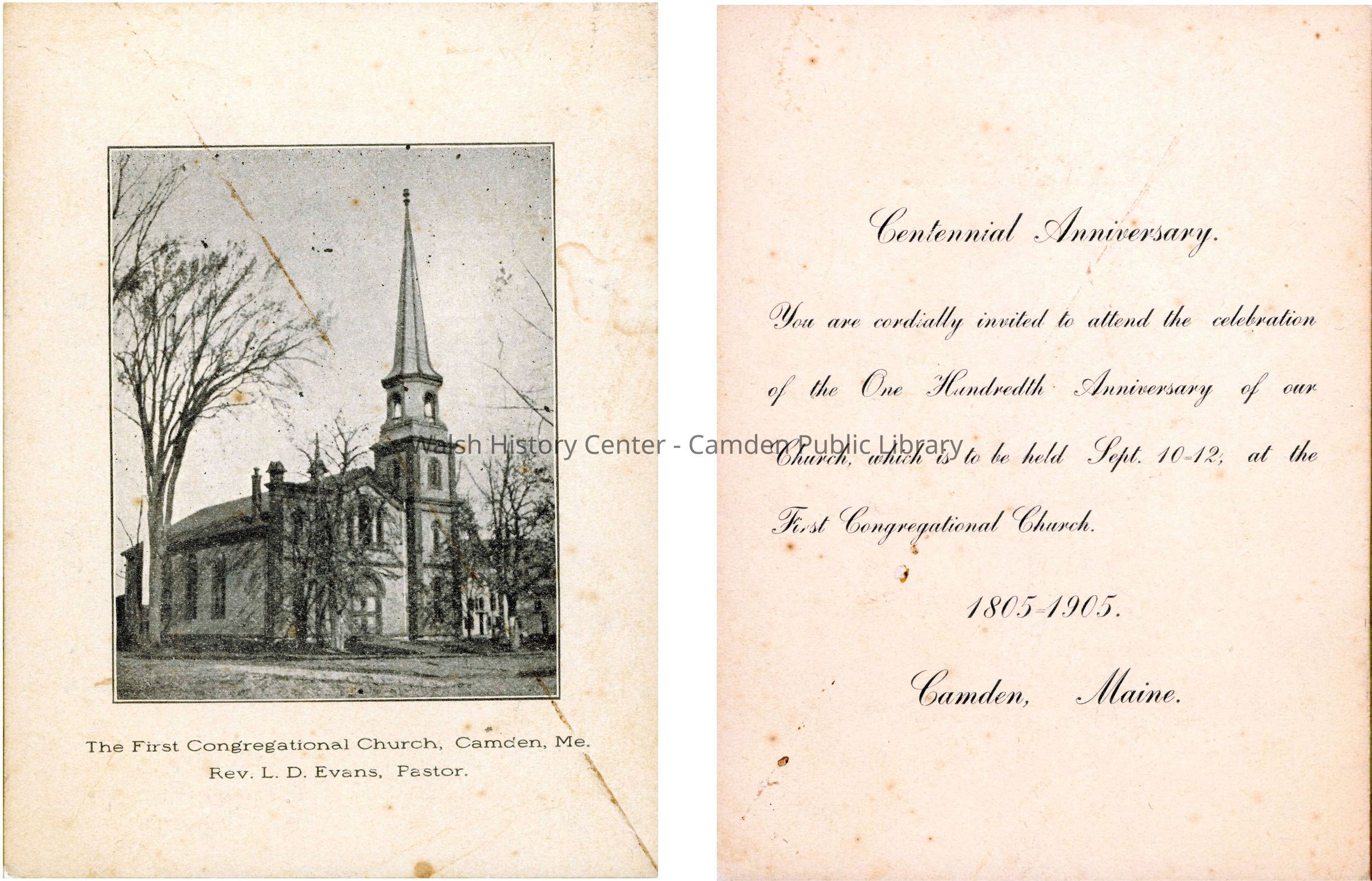 Invitation to the First Congregational Church's Centennial Anniversary celebration, held on September 10-12, 1905. Rev. L. D. Evans, Pastor.Collection
