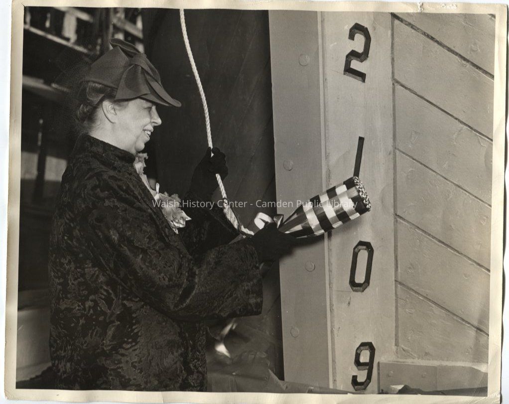 First Lady Eleanor Roosevelt prepares to christen the barge "Pine Tree." The 194-foot barge was the largest wooden vessel built in the nation since the 1920s, and was the first of many to be built to relieve the fuel transportation problem by carrying coal. Members of the Penobscot tribe performed ritual dances to give the ship good luck.Collection