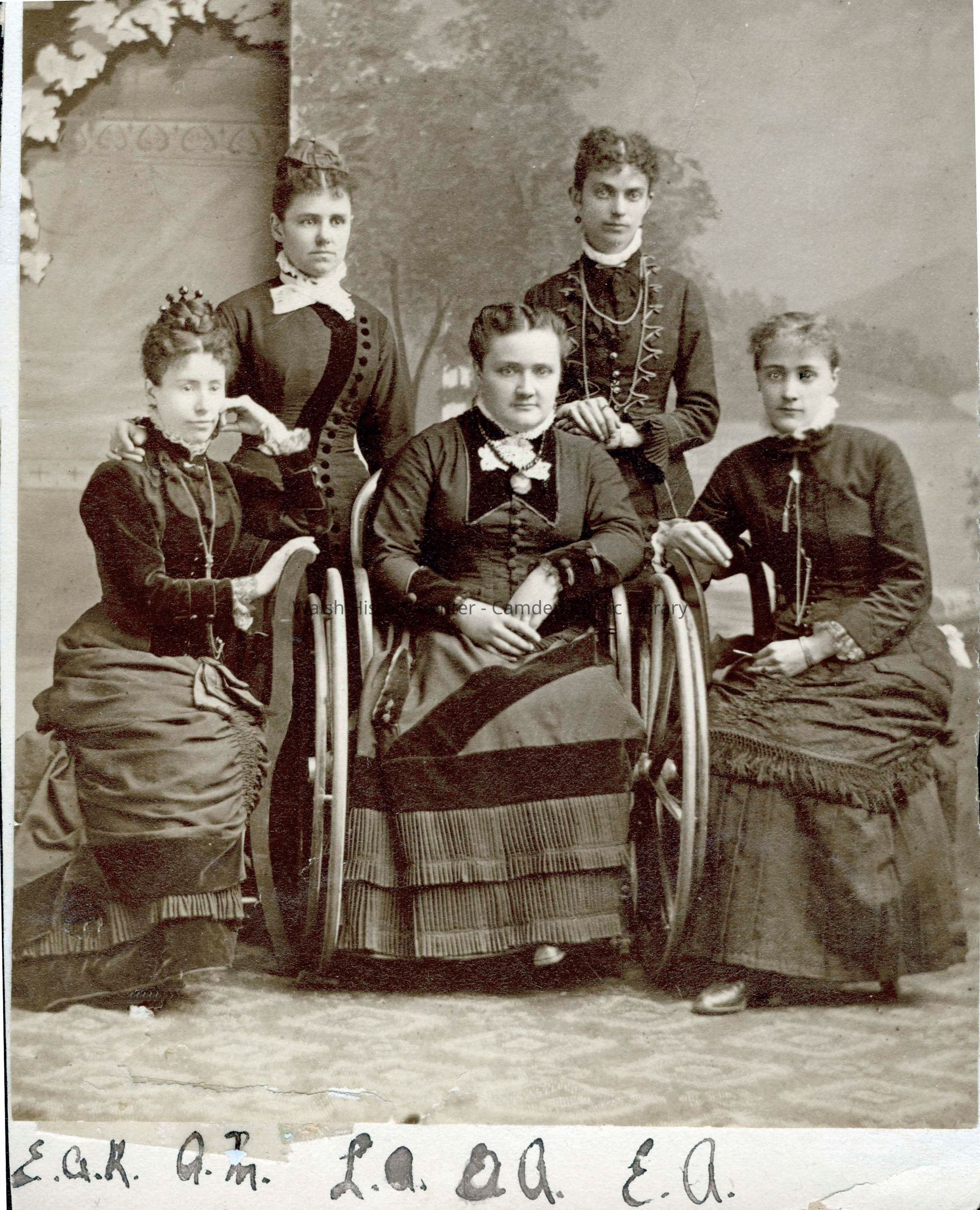 Portrait of five unidentified women (one in wheelchair) circa 1885. Initials are written under each woman. There is a portrait of a baby glued on back with inscription: "Arthur (6 mos.)"Collection