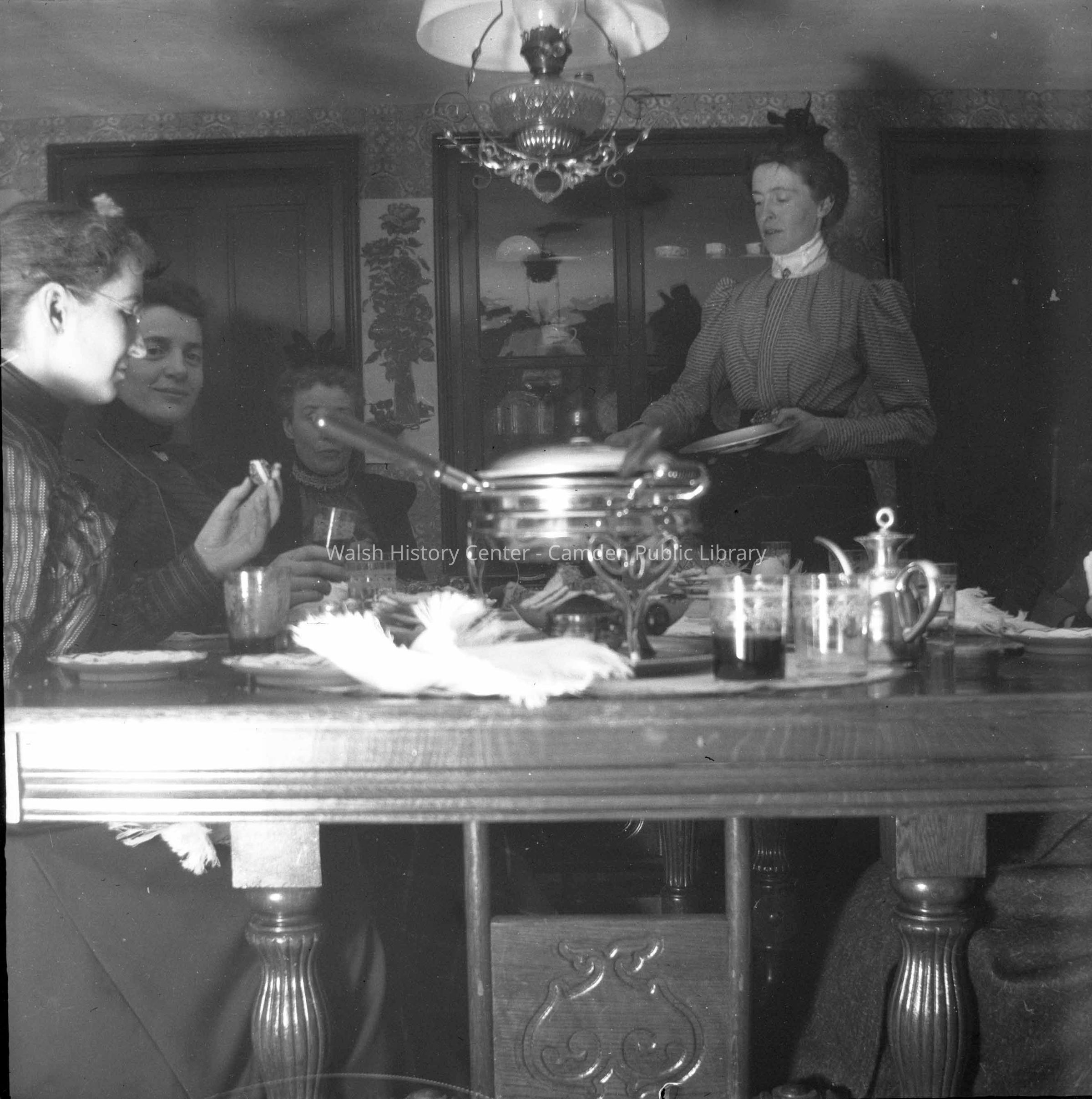 Black & white photo labeled "Flashlights & Chafing Dish Time, February 1900." Theresa Babb is standing with a plate in her hand. The 3 other women are unknown.Collection