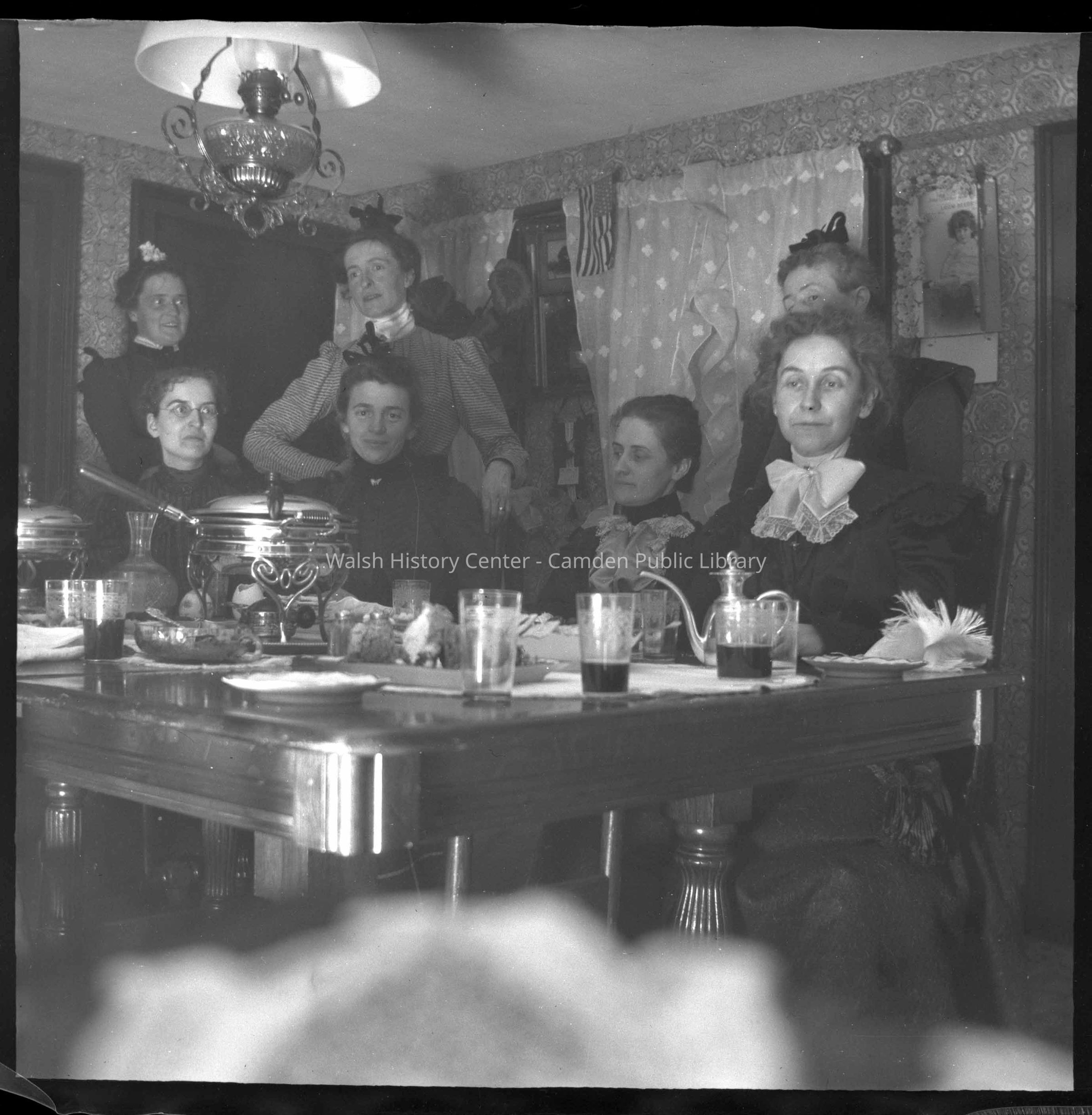 Black & white photo labeled "Flashlights & Chafing Dish Time, February 1900." Theresa Babb is standing in the middle of the photo. The other women are unidentified.Collection