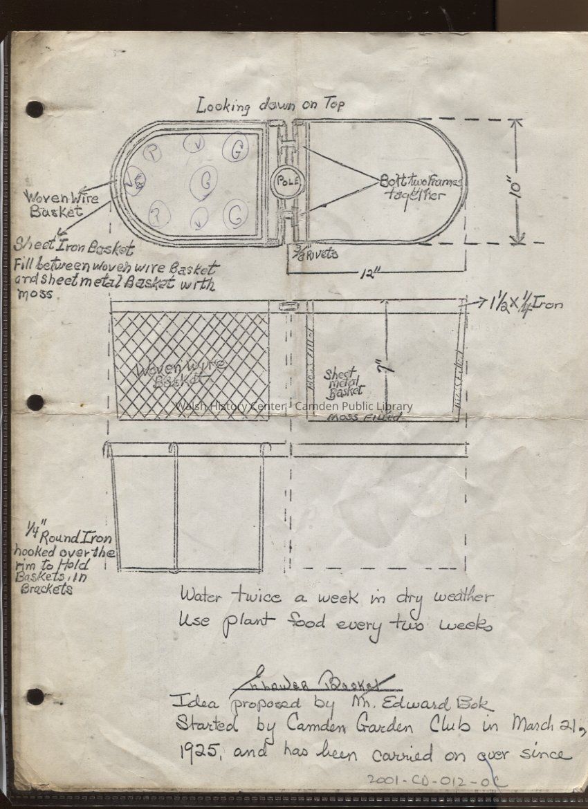 Photocopy of design for lamp post flower baskets proposed by Edward Bok. Project begun by the Camden Garden Club on March 25, 1925 and continued to present day.Collection