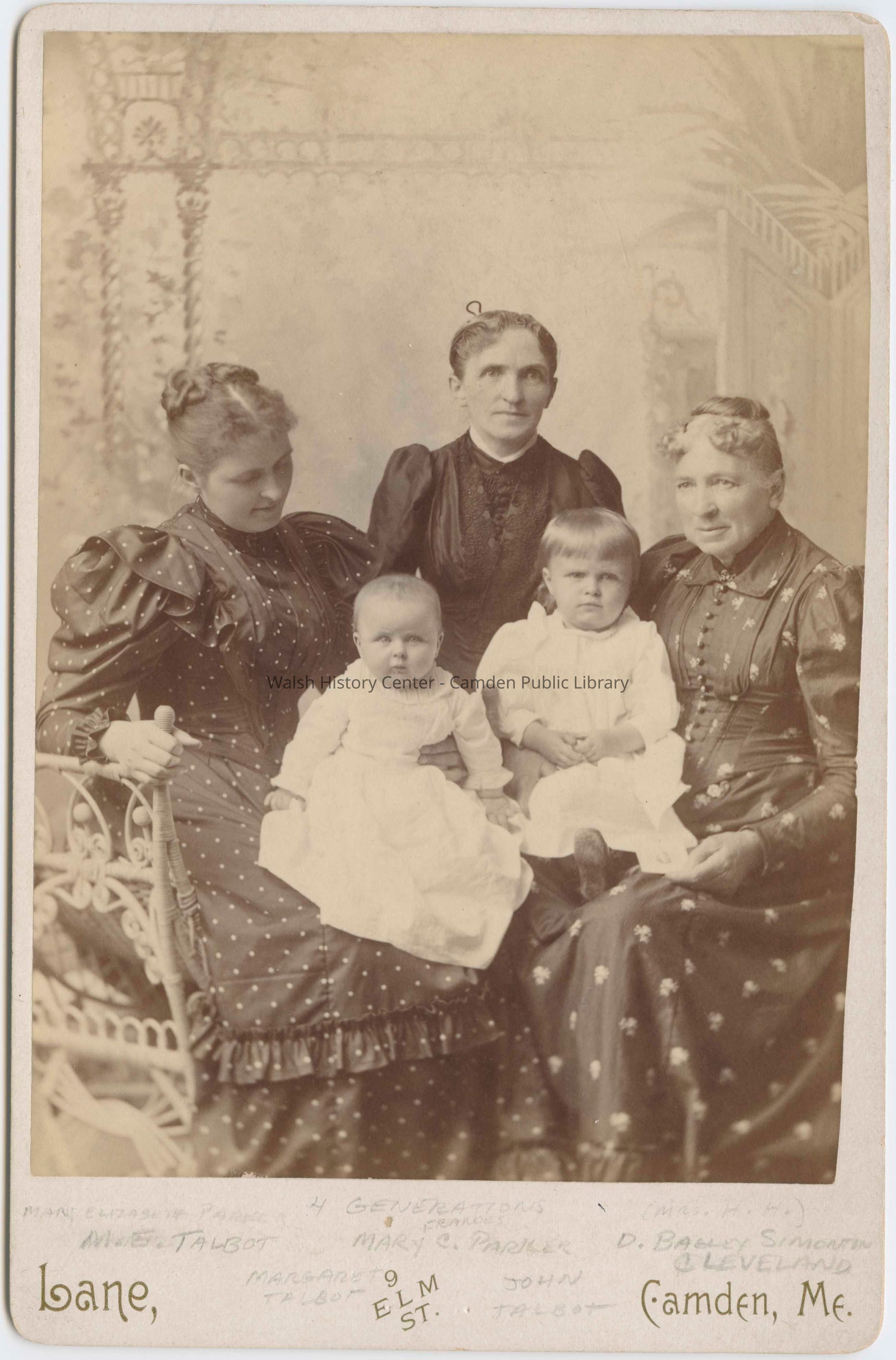 Sepia cabinet card photograph of 4 generations of women in the Parker family. Mary Frances Cleveland Parker is at center and her mother Dorcas Bagley Simonton Cleveland (Mrs. Harvey H. Cleveland) is seated at far right. Mary's daughter Mary Elizabeth Parker Talbot is at the left with her daughter Margaret on her lap. Mrs. Cleveland is holding Mary Elizabeth's son John Talbot. Mary Parker is the mother of Theresa Parker Babb, who married Charles Wilkes Babb, superintendent of the Knox Woolen Mill. Theresa's extensive collection of photos of the family is in the Walsh History Center archives.Collection
