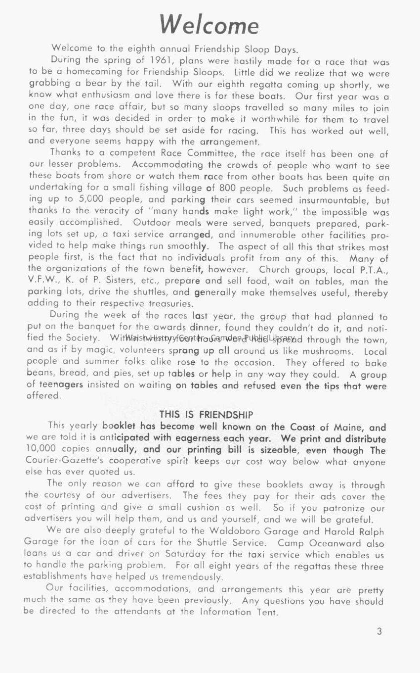Program details for the 1968 Friendship Sloop Days event. Includes advertisers, list of Friendship sloops by name, class, builder, year built, footage, and owner. Includes comments about Friendship Sloop Society Scholarship Fund, Schooner "Bowdoin", Friendship Museum and other local areas and items of interest. Identifies new sloops and owners of the Society.Collection