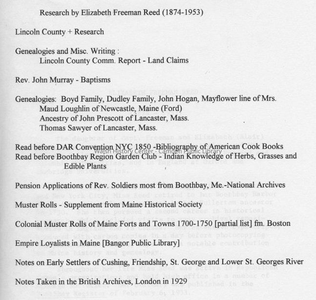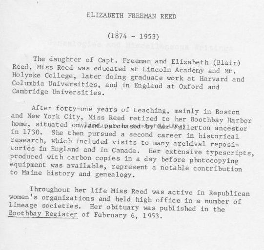 Typescripts of genealogical research by Elizabeth Freeman Reed (1874-1953) conducted by her after her retirement to Fullerton ancestor land (purchased 1730) in Boothbay Harbor. Includes Muster Rolls, information on Empire Loyalists in Maine and notes taken in the British Archives.