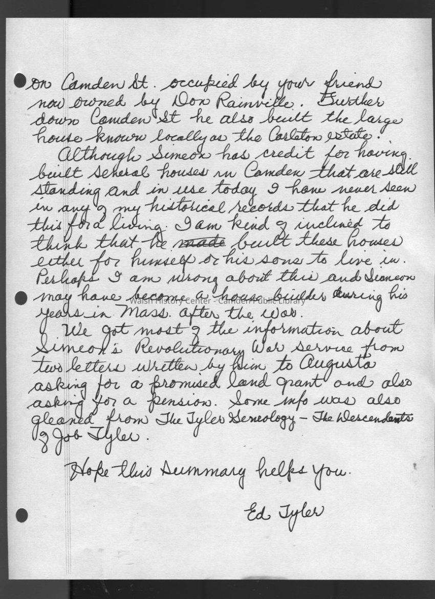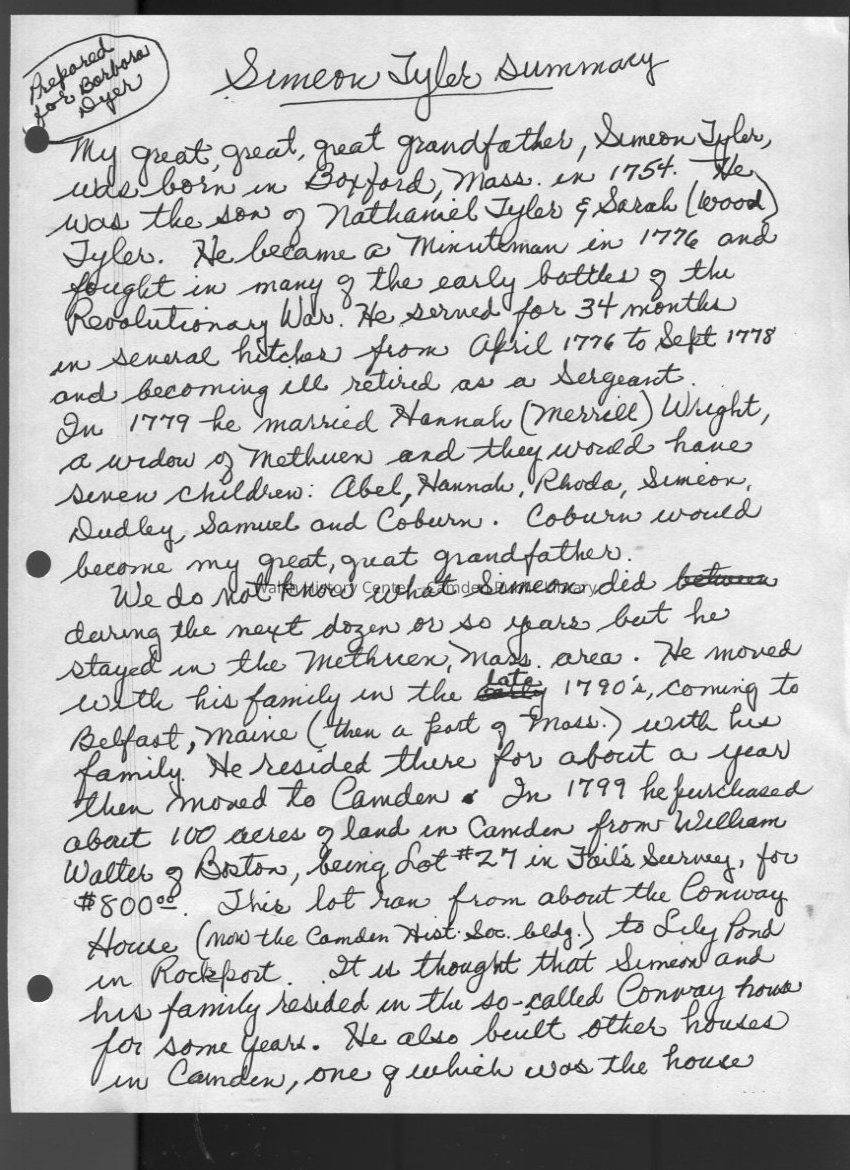 Blue 3-ring binder of photocopied research materials relating to the genealogy of Job Tyler (1619-1700). His descendant Simeon Tyler (1754-1840) was born in Boxford, MA the son of Nathaniel and Sara (Wood) Tyler. Simeon joined the Revolutionary War as a Minuteman in 1776 and served through 1778. He married Hannah Merrill Wright and had seven children: Abel, Hannah, Rhoda, Simeon, Dudley, Samuel, and Coburn. Simeon the elder moved to Camden and purchased 100 acres of land (Lot #27) of Fales' Survey from William Walter of Boston for $800. It is thought that his family resided in what is now known as the Conway House on the town line of Camden and Rockport.Collection