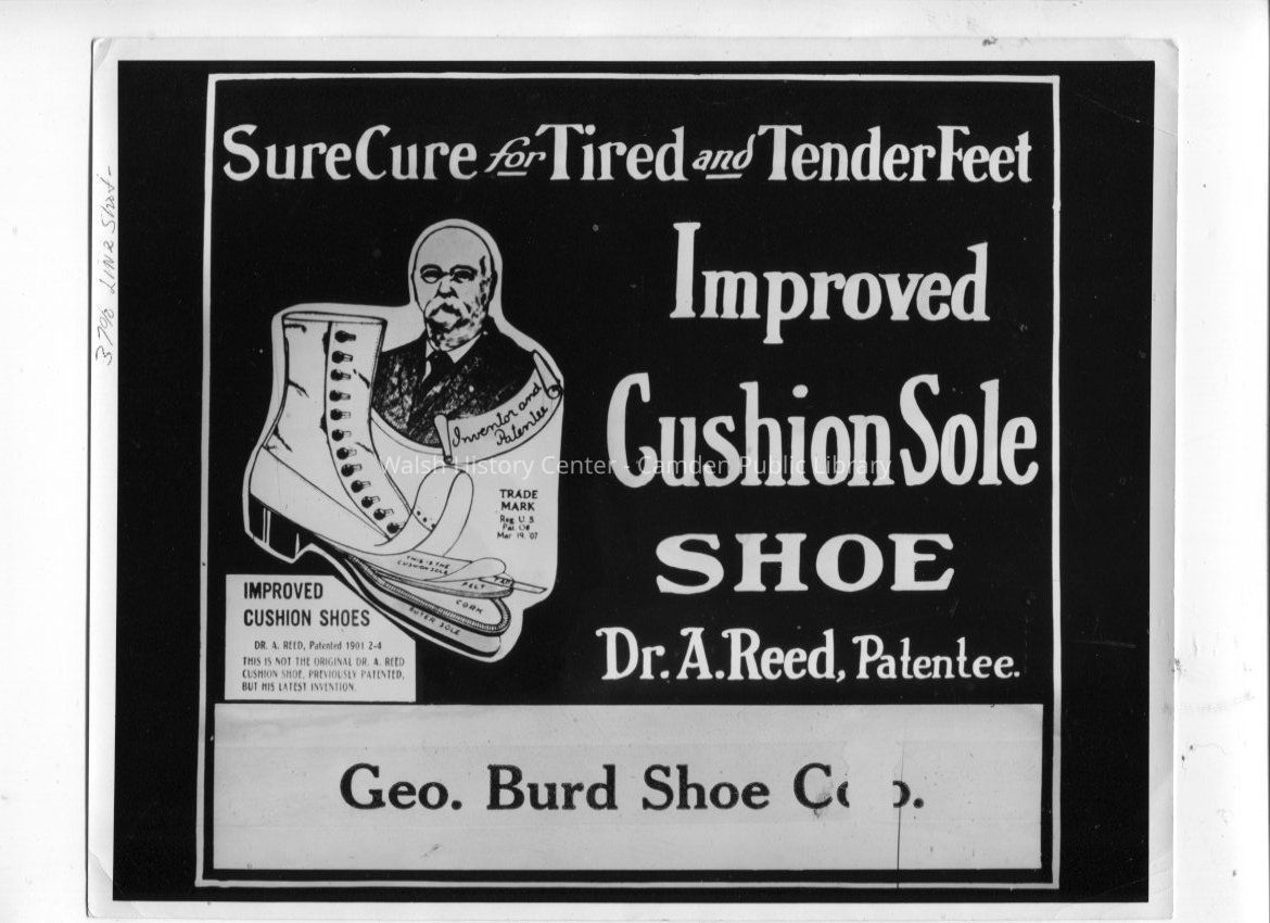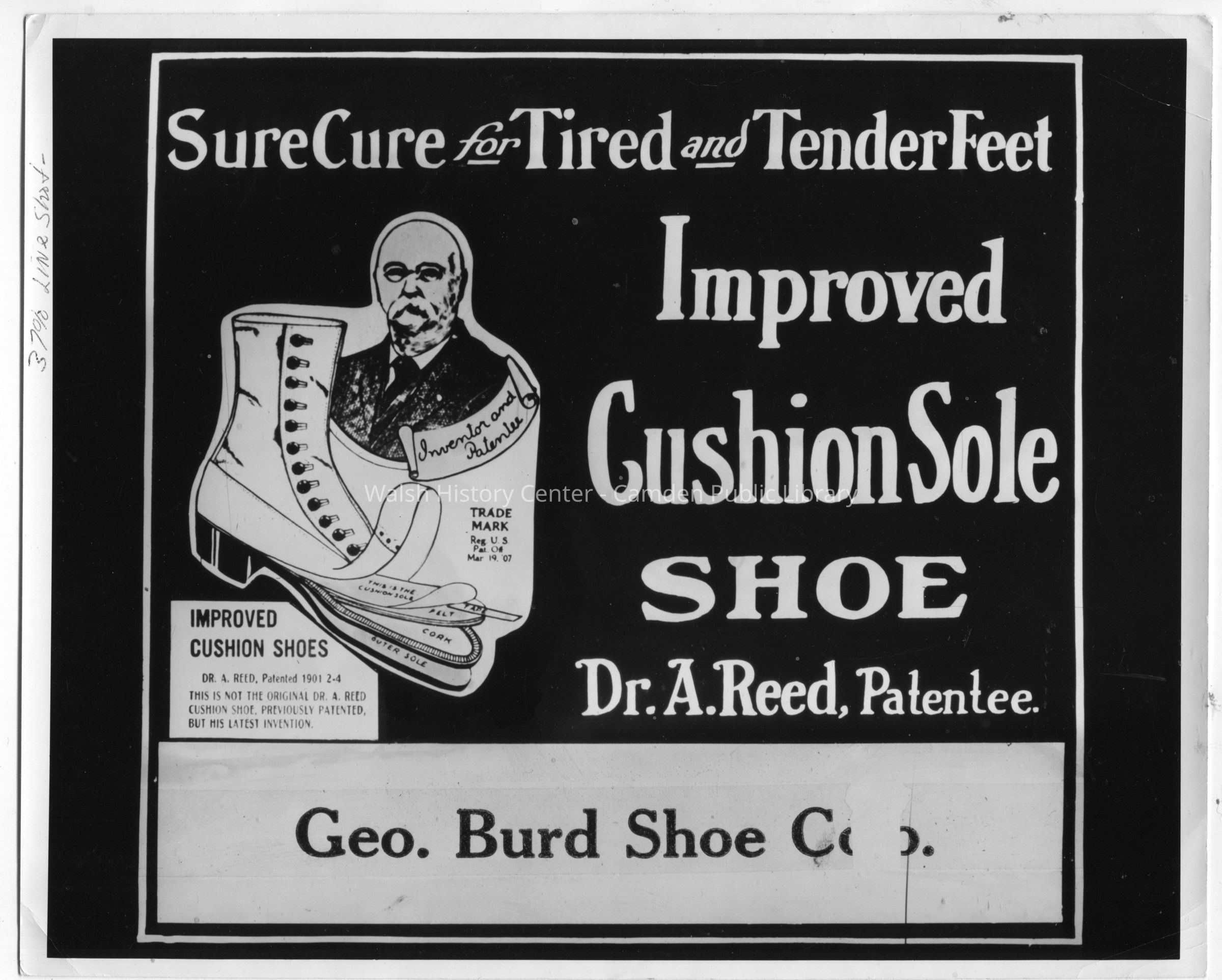 Black and white photograph of an advertisement for the George Burd Shoe Company in Camden, Maine. The ad is circa 1907.Collection