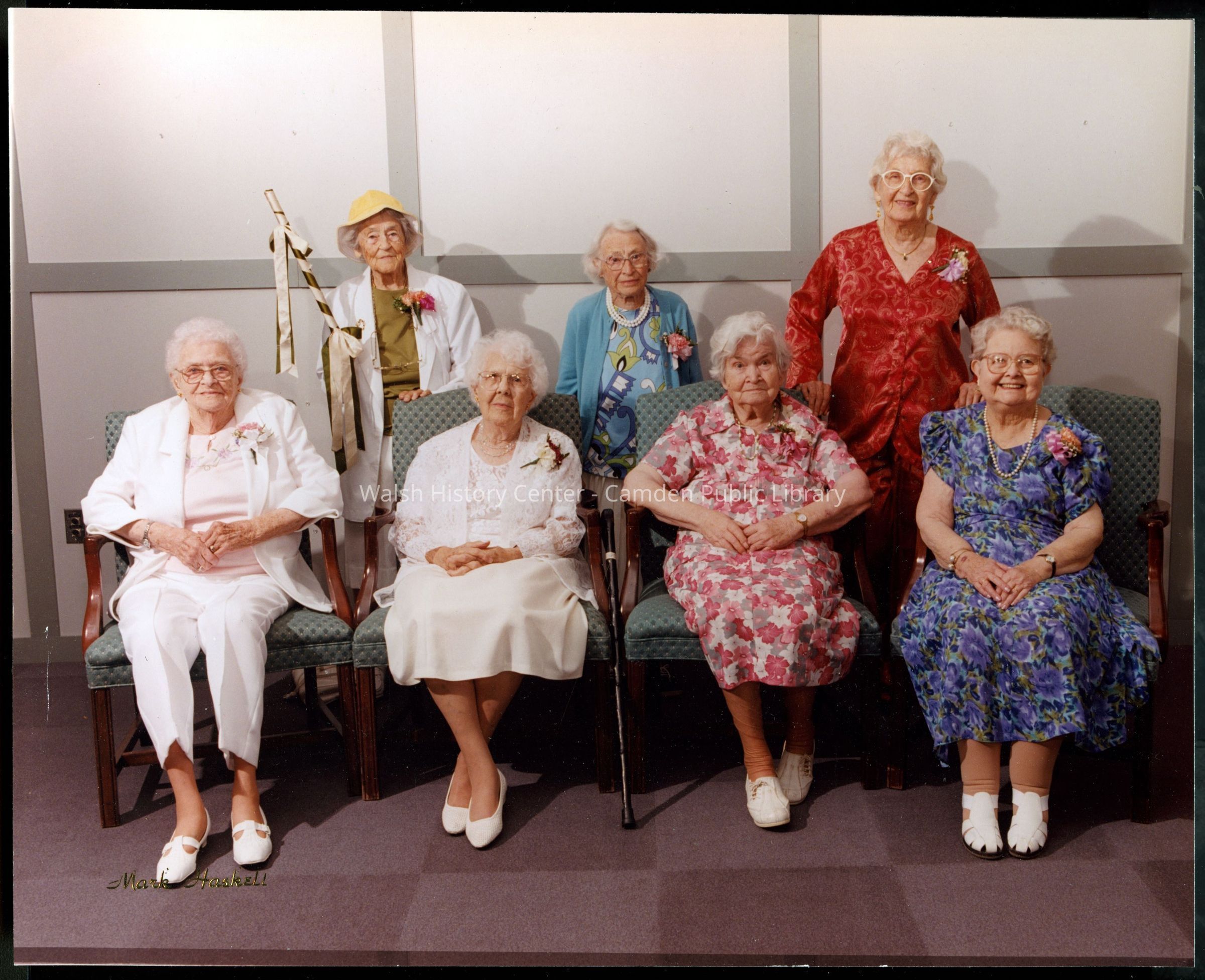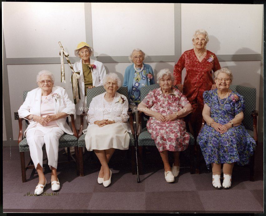 Color photograph of Gladys Fernald Young with friends. Back row: Gladys F. Young, Isabel Ames, and Frances Alexander Schipper. Front row: Lillian Dyer Huntley, _____, Flora Wright, and Lillian Clark Shaw.Collection