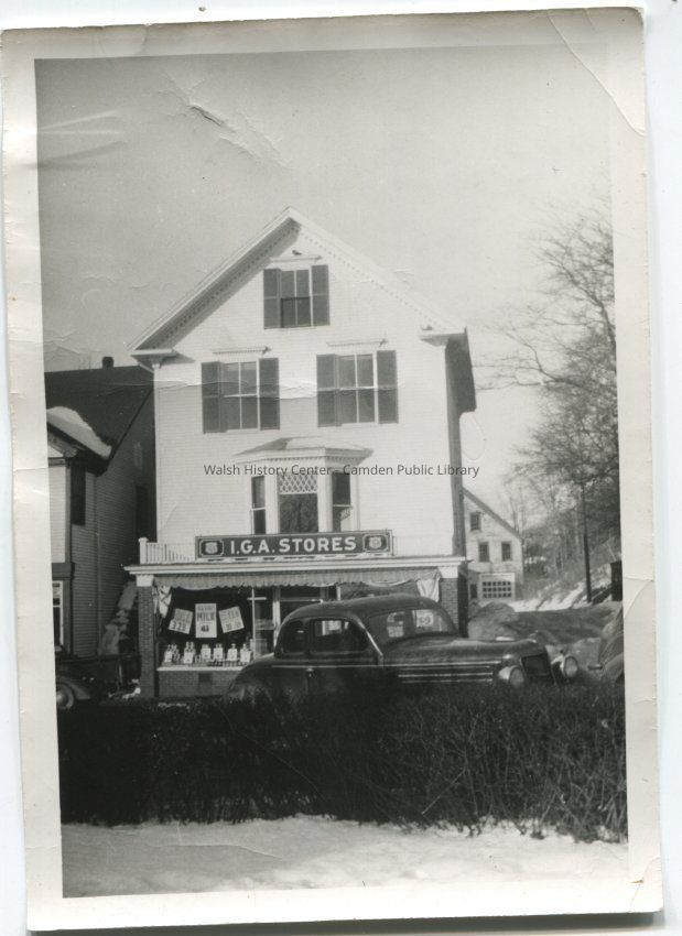 Black and white photograph of IGA store owned by Gleason Perry located on Main Street in Camden, across from Harbor Park. Photo circa 1930s.Collection